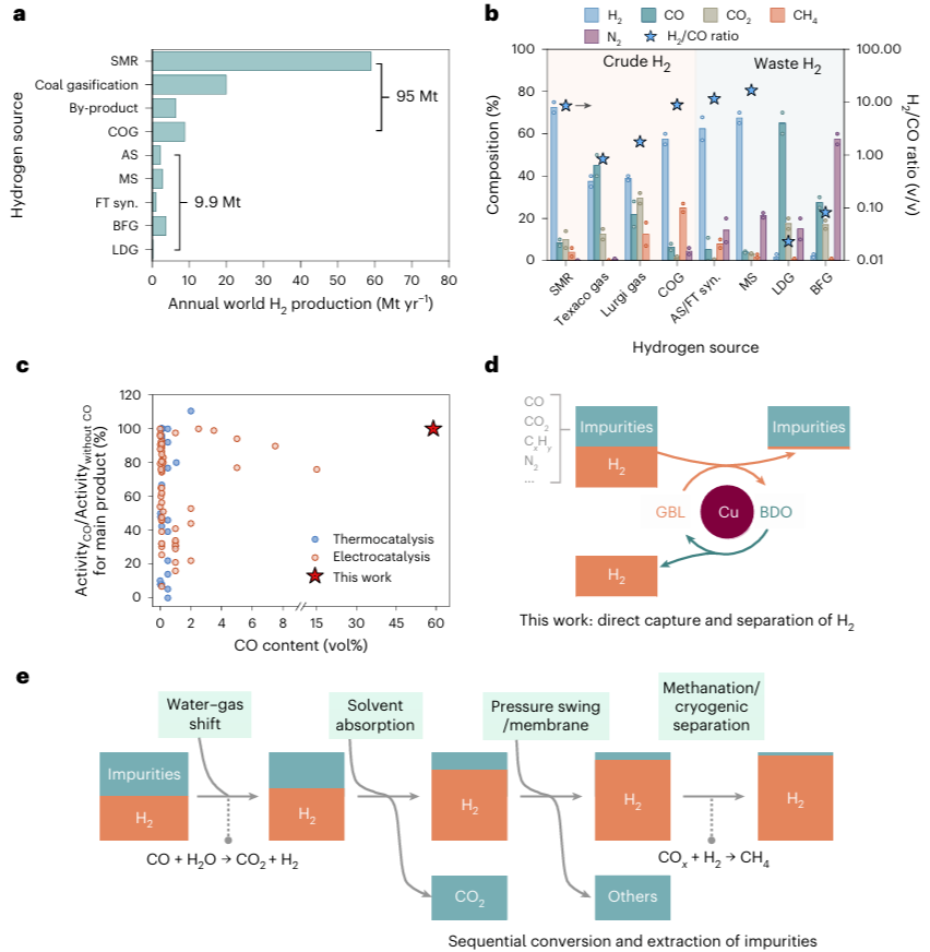 图1. (a)全球粗氢和废氢的年产量。(b)代表性粗氢和废氢资源的组成。柱高代表气体成分浓度的平均值,点表示浓度范围的最小值和最大值。(c)一氧化碳对催化活性影响的调查。x轴的中断是为了清晰显示低浓度一氧化碳的数据点。(d)铜催化的GBL-BDO相互转化直接从粗氢和废氢中捕获氢气。(e)传统顺序工艺用于氢气分离中的杂质提取。副产品主要包括在炼油厂和石化工业中产生的氢气,其中焦炉煤气单独列出。Texaco和Lurgi气体指的是煤炭气化的两种粗氢类型。SMR:蒸汽甲烷重整;COG:焦炉煤气;AS:氨合成;MS:甲醇合成;FT合成:费托合成;BFG:高炉煤气;LDG:林茨-多瑙转炉煤气。