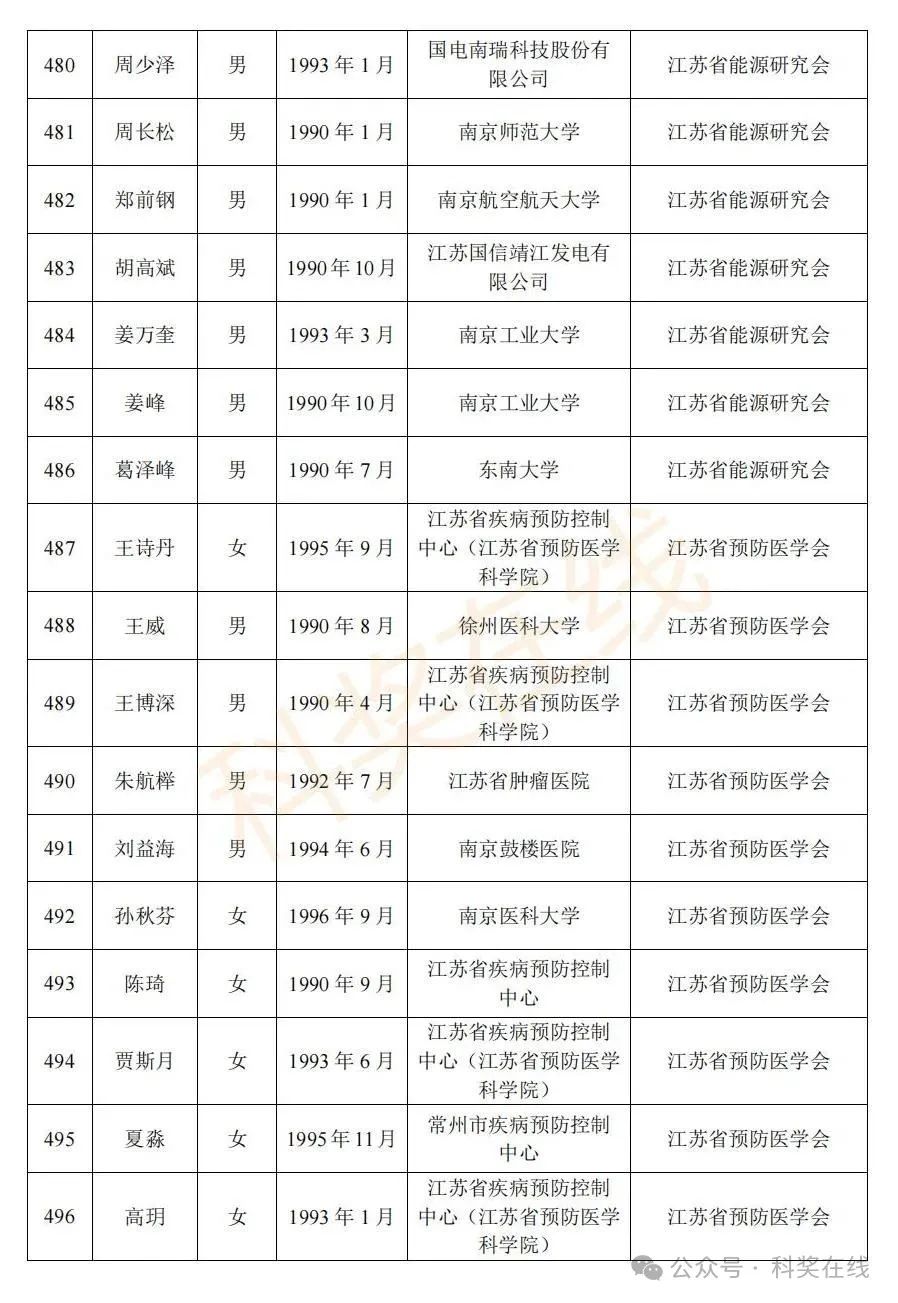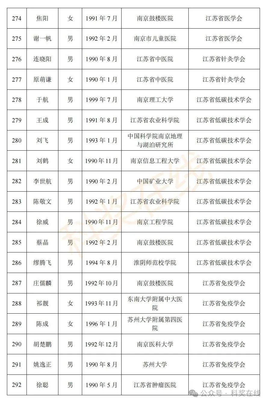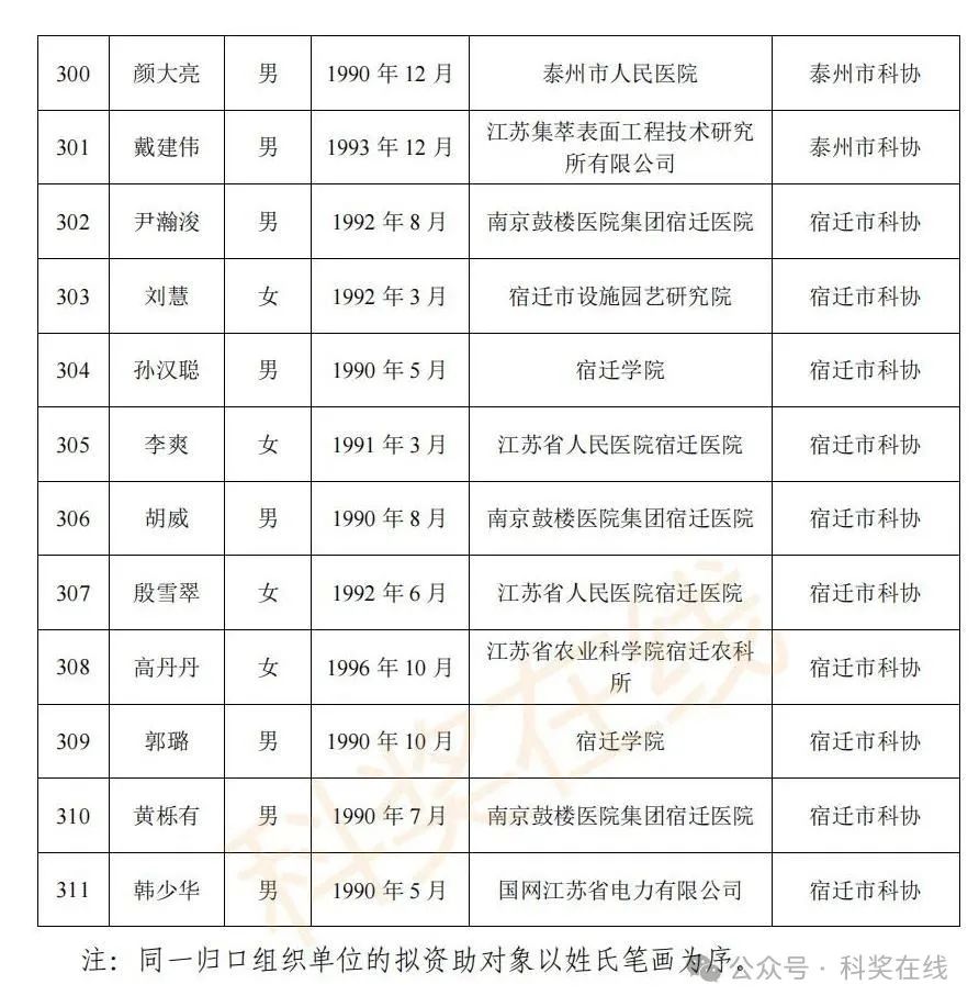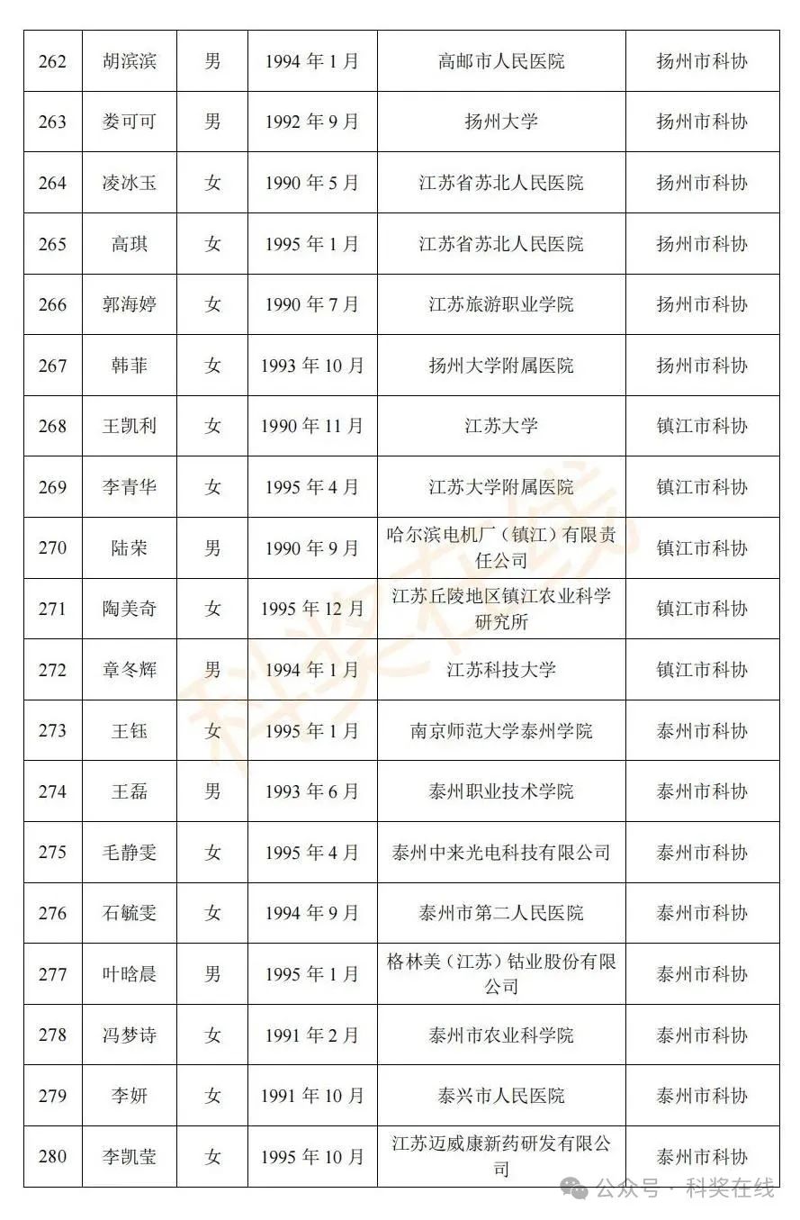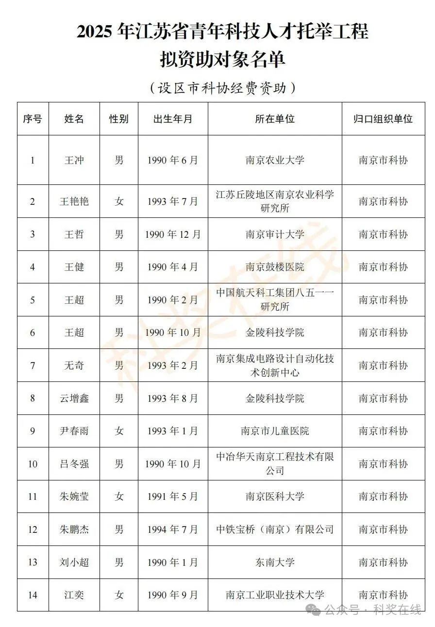 关于2025年江苏省青年科技人才托举工程拟资助对象的公示根据《关于开展2025年江苏省青年科技人才托举工程资助对象评选推荐工作的通知》,经各省级学会、省部属企事业单位、高校和设区市科协广泛发动,多渠道申报,专家评审,拟确定王再禹等1004名同志为2025年江苏省青年科技人才托举工程资助对象,现面向社会公示。