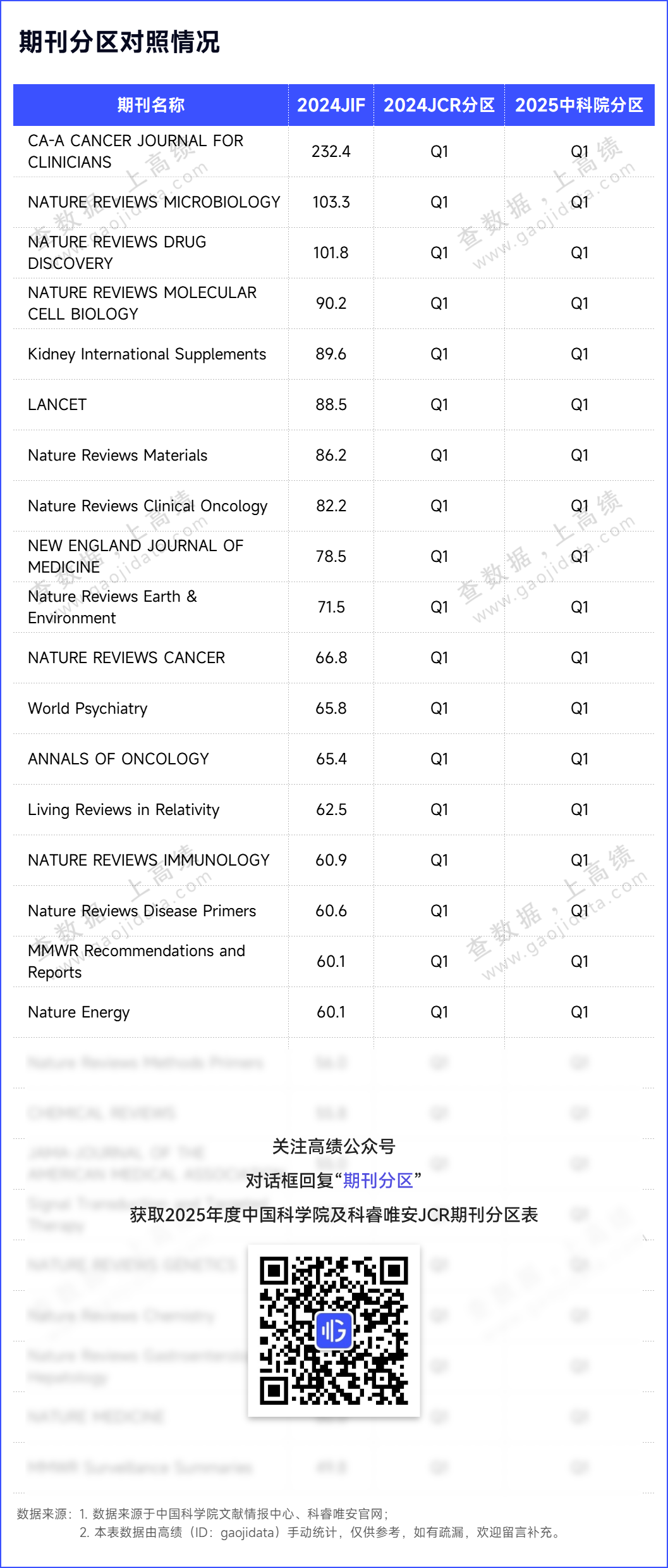 JCR则按照Web of Science的254个学科,把所有期刊按各个学科领域分类后,以影响因子为标准,平均分为4等分,即是Q1~Q4区。需要注意的是,同一个期刊可能出现在多个学科中,在某个学科为Q1区,但在另外一个学科中则可能为Q2区。通常所说的JCR分区即是指JIF分区。