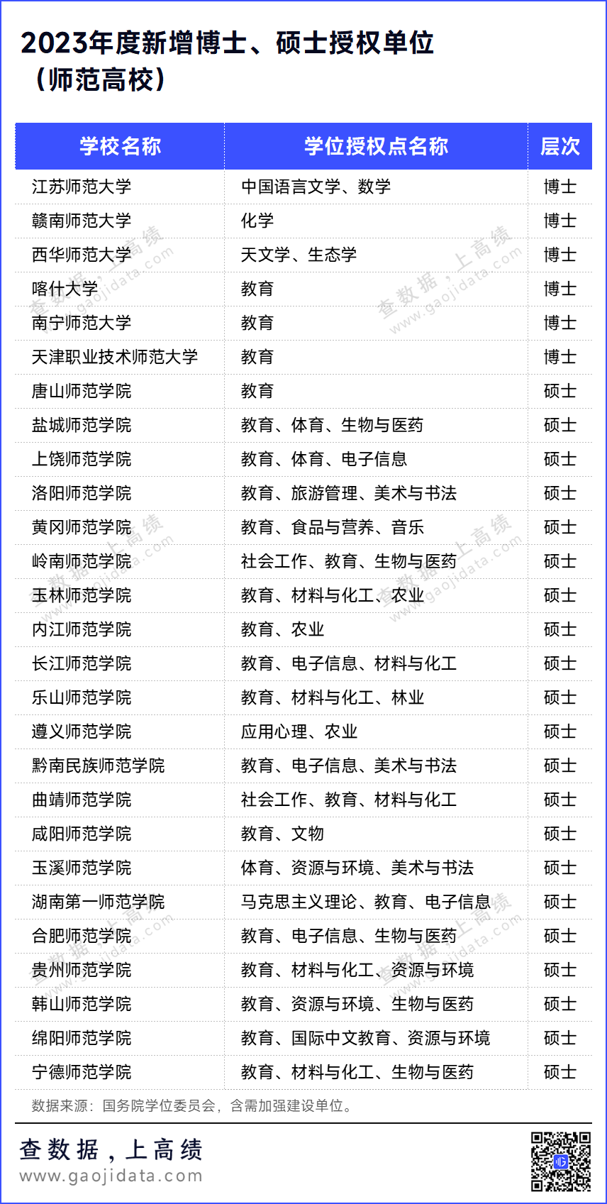 回复下载 关注“高绩”公众号,对话框回复“申博”,获取各省博士、硕士学位授予立项建设单位名单。 硕博教师,人才紧缺