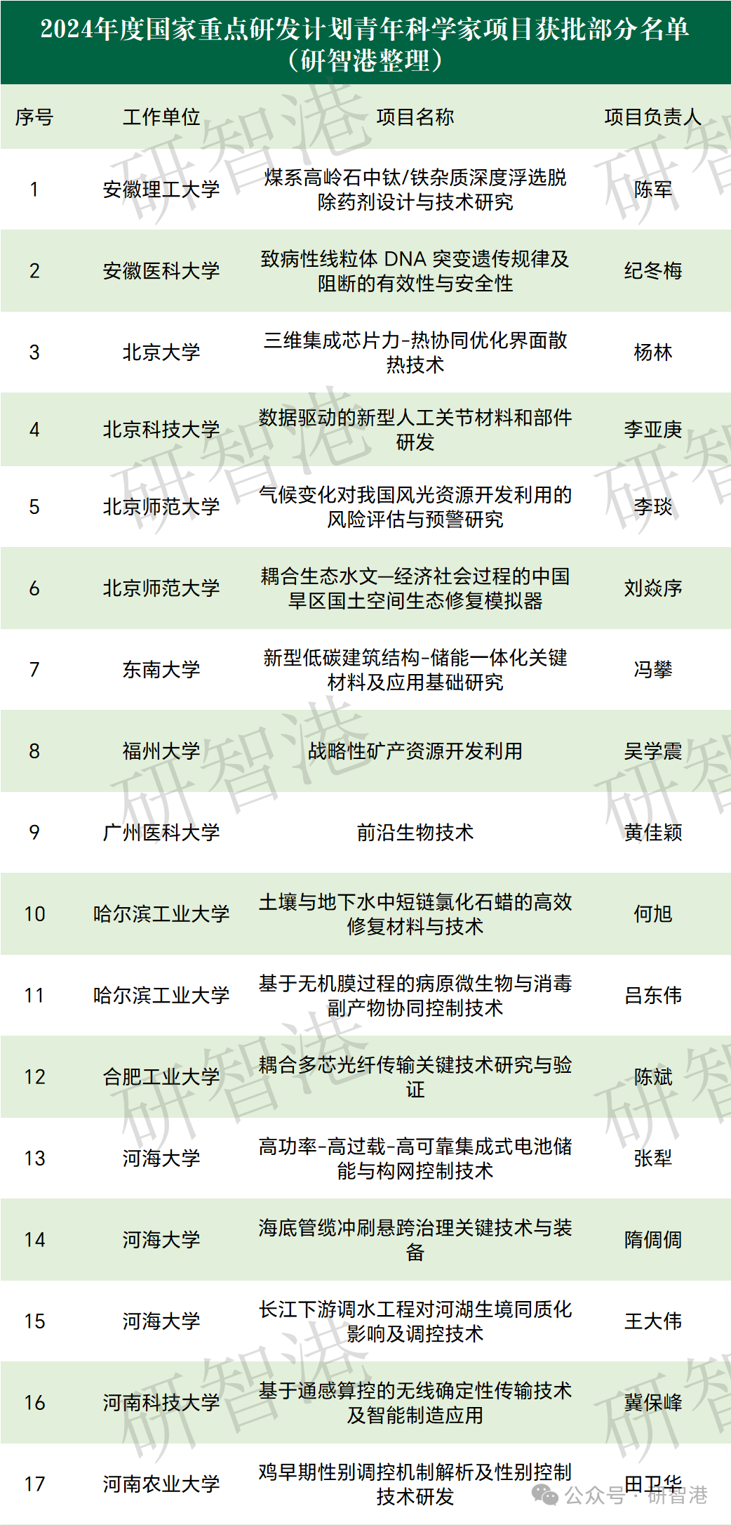 日前,多所高校启动了获批国家重点研发计划重点专项项目与青年科学家项目,研智港现将其整理如下: