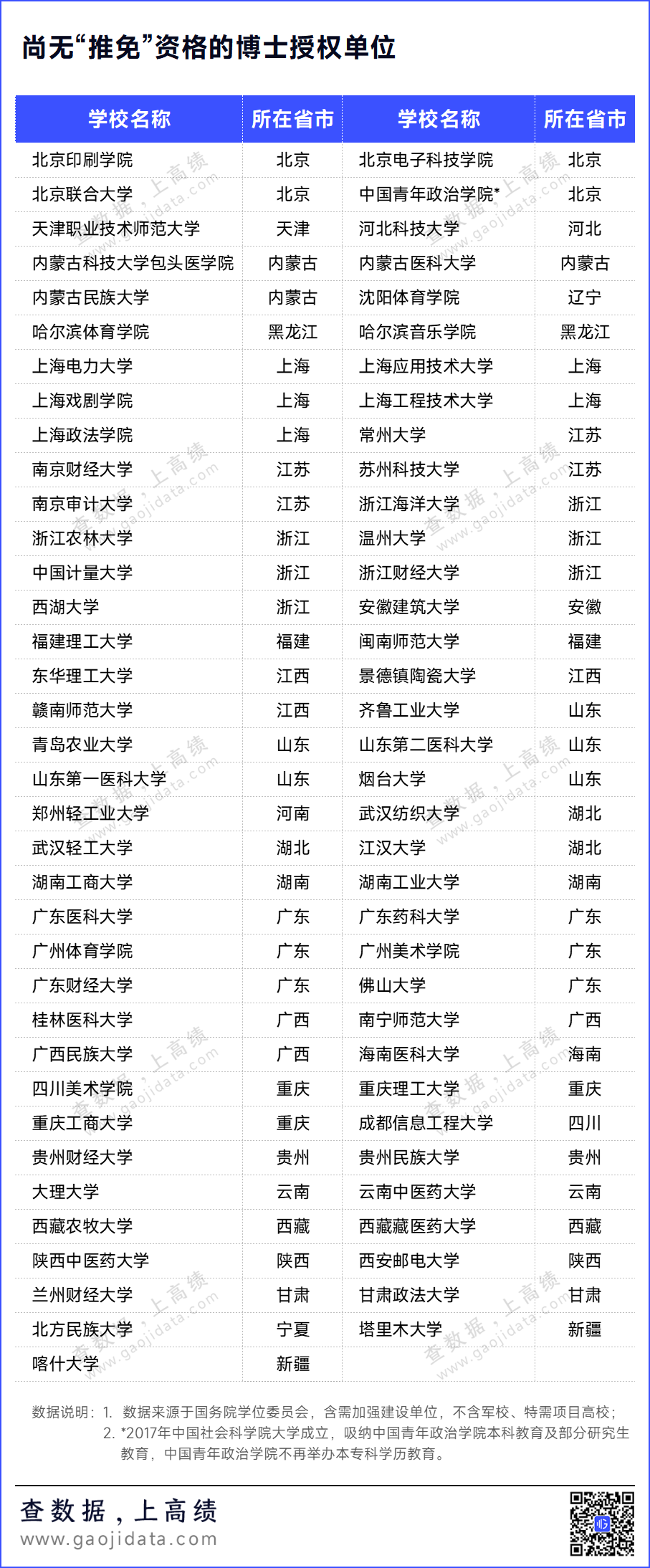 此次黑龙江省拟推荐的齐齐哈尔大学获硕士学位授予权已满15年,哈尔滨体育学院更是已增列为博士授权单位。当前,71所博士授权高校暂无“推免”资格(不含军校、博士研究生特需项目高校)。除中国青年政治学院不再举办本专科学历教育以外,其余70所高校获将在新一轮选拔中脱颖而出。