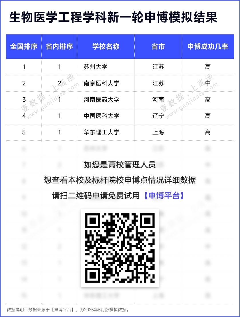新一轮申博模拟数据来源于【申博平台】。该平台是专门服务于高校博士点申报工作的一站式平台,集聚学科专家的经验和智慧,能够帮助学校分析申博学科的当前水平、评估申博学科的成功几率、优化申博学科的申报策略、打磨申博学科的申报材料。授权用户可登录【申博平台】,查看本校及对标学校申博点具体情况。未授权用户可以扫描下方二维码,申请免费试用。
