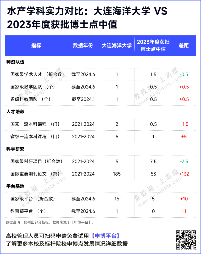 《2023年度审核增列的博士、硕士学位授予单位及其学位授权点名单》显示,2023年度新增了2个水产学科的博士点,即海南大学和浙江海洋大学。根据大连海洋大学目前的建设成果,与2023年度新增的博士点中值相比,学校在多个方面已呈现出超越之势,特别是“平台基地”。此外,课程教材、国际重要期刊论文也表现不俗。学校拥有水产养殖学国家级实验教学示范中心、水产养殖学专业人才培养模式创新实验区等国家级平台,《贝类与贝类增养殖学》(常亚青)、《养殖水环境化学》(王华)入选国家一流本科课程。但值得注意的是,在国家级学术人才、国家级科研项目等方面学校仍需加大建设力度。
