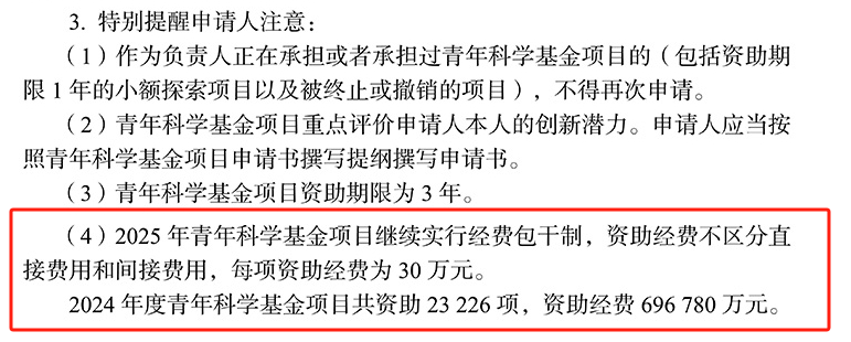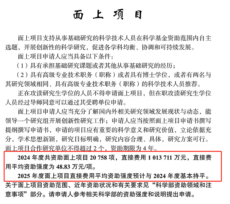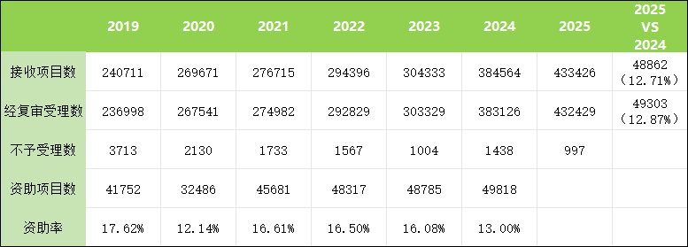2025年国家自然科学基金(国自然)评审已经结束,整体资助率预计将创新低,面临激烈竞争和资助困境。2024年国自然整体资助率约13%,其中面上项目资助率仅11.66%,青年项目15.54%,已经处于较低水平。2025年面上项目资助率预计可能跌至11.19%甚至更低,创近年来新低。 资助率或创新低 2023年12月,国家自然科学基金委发布了2024年度国家自然科学基金改革举措,宣布“取消申二停一”、“取消依托单位变更限制”、“放宽女性年龄”等一系列改革举措,进一步放松了国自然的申请限制。因此,2024年国家自然科学基金集中接收期项目申请量呈现爆发式增长,总量达到384564项,较2023年同比增长率高达26.36%。这一增幅与2023年仅3.7%的增长率形成鲜明对比。 而2025年度项目申请集中接收期间共接收各类型项目申请433426项,经初审受理432429项,较2024年的384564项又增长12.71%(复审后应略微上涨),增幅巨大。而不予受理项目申请仅997项,近5年首次低于1000项,占比也仅有0.23%,较2024年大幅下降30.8%,历史最低。 从资助率来看,2021-2023年间虽然逐年小幅下降,但始终保持在16%左右的水平;而2024年却大幅下滑至13%,创下近年新低。 2025年度自然科学基金项目总预算为394.58亿元,比2024年执行数增加31.43亿元,增长8.65%。而经费8.65%的增幅显著低于申请总量12.71%的增幅,新一年资助率可能创下历史新低~ 青年与面上项目影响最多 研究经费的总增幅匹配不上基金申请量的增幅,资助率持续下降,其中对科研人员赖以生存的青年基金与面上项目,带来的竞争压力将会进一步加剧。 国家自然科学基金委员会网站《2025年度部门预算》 面上项目:2023年资助率17%,2024年猛跌至11.7%,假设申请量占比维持2024年约46.28%的水平,则申请量将达到约200590项。预计2025年面上资助项数可能在20760项左右,资助率约为10.34%。 青年基金:2023年资助率17%,2024年跌至15.5%,若保持38.87%的申请占比(约168473项),以30万元/项的资助标准计算,预计2025年资助项目数约23226项。这意味着资助率可能进一步下滑至13.79%,较往年呈现持续走低趋势。 近年来,国家自然科学基金的竞争态势日趋激烈。评审标准从早期偏重研究热点和论文数量,逐步转向更加注重科研成果质量、项目设计的科学性以及申请人的整体科研能力。 科研学者唯有立足学科前沿,深耕基础研究,持续提升学术原创性与研究质量;同时,需精准凝练关键科学问题,精心设计与论证研究方案,突出项目的创新价值与应用潜力;并强化学术交流与合作,不断优化申报材料表述的严谨性与清晰度。唯有将研究实力、创新思维与申报技巧紧密结合,方能在这高强度的竞争中有效提升项目获批的竞争力与成功率。