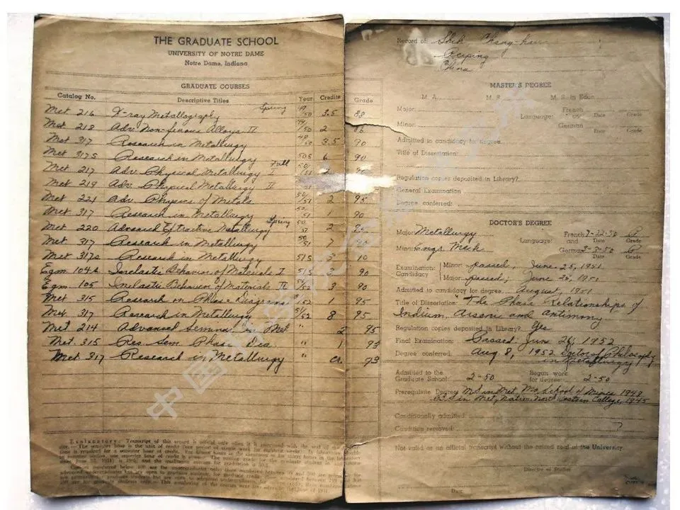 师昌绪在欧特丹大学攻读博士学位时的成绩单(中国科学院金属研究所档案室藏)