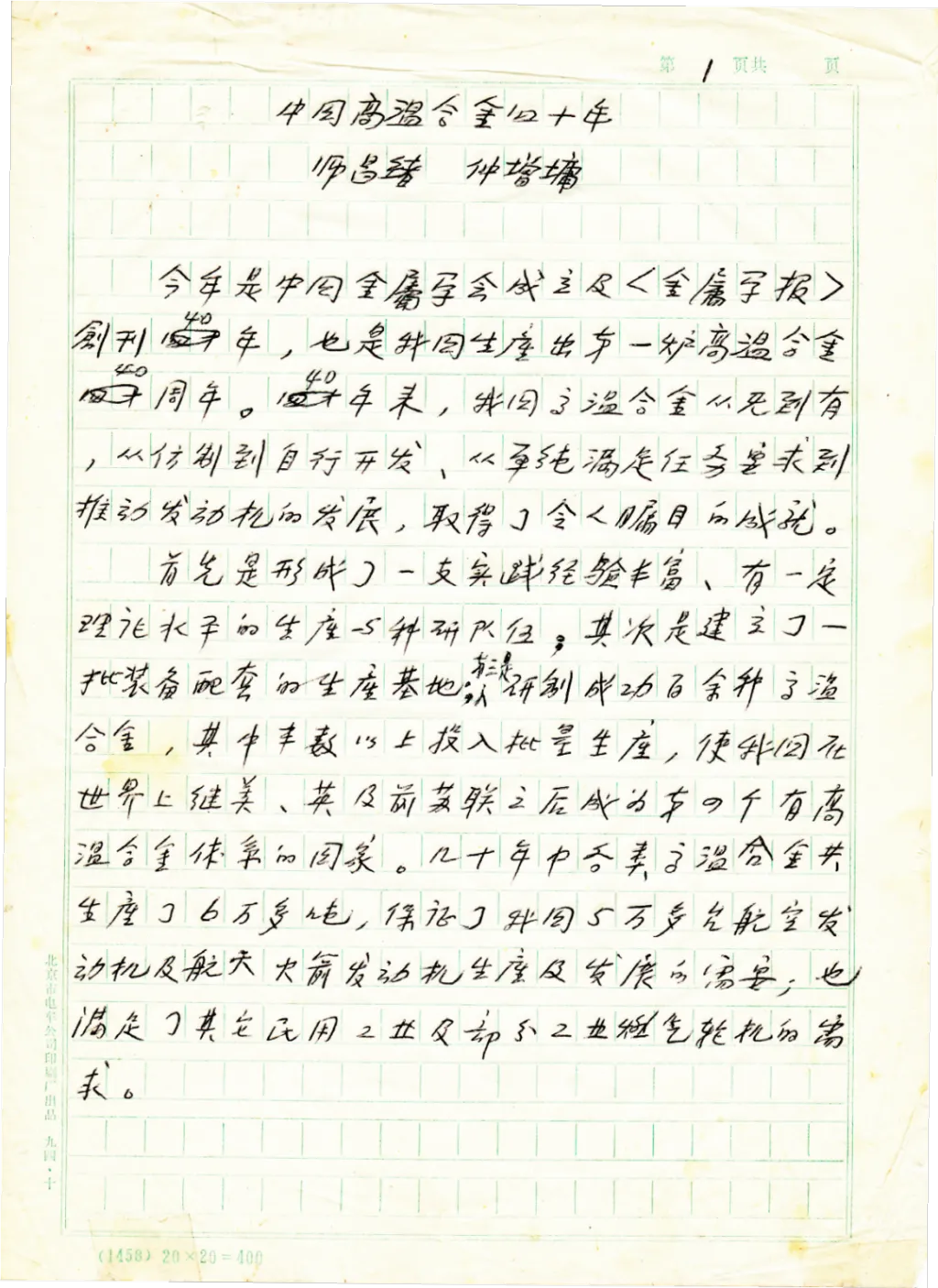 师昌绪编写的《中国高温合金四十年》手稿(部分)(中国科学院金属研究所档案室藏)
