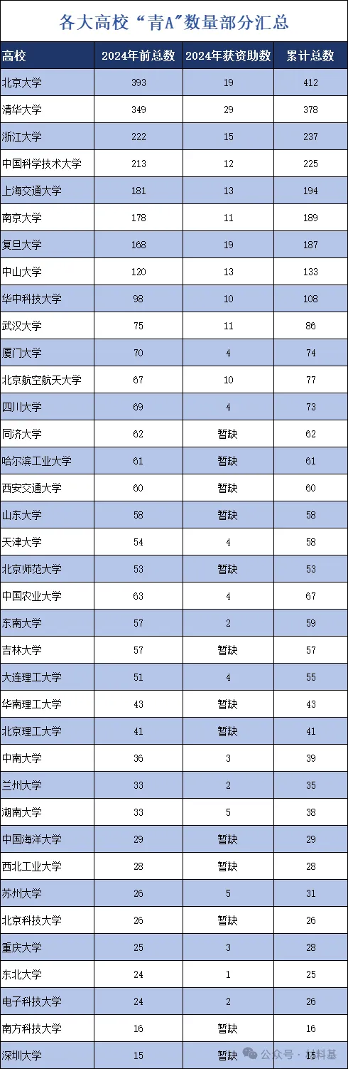 截止2024各大高校青A数量部分汇总