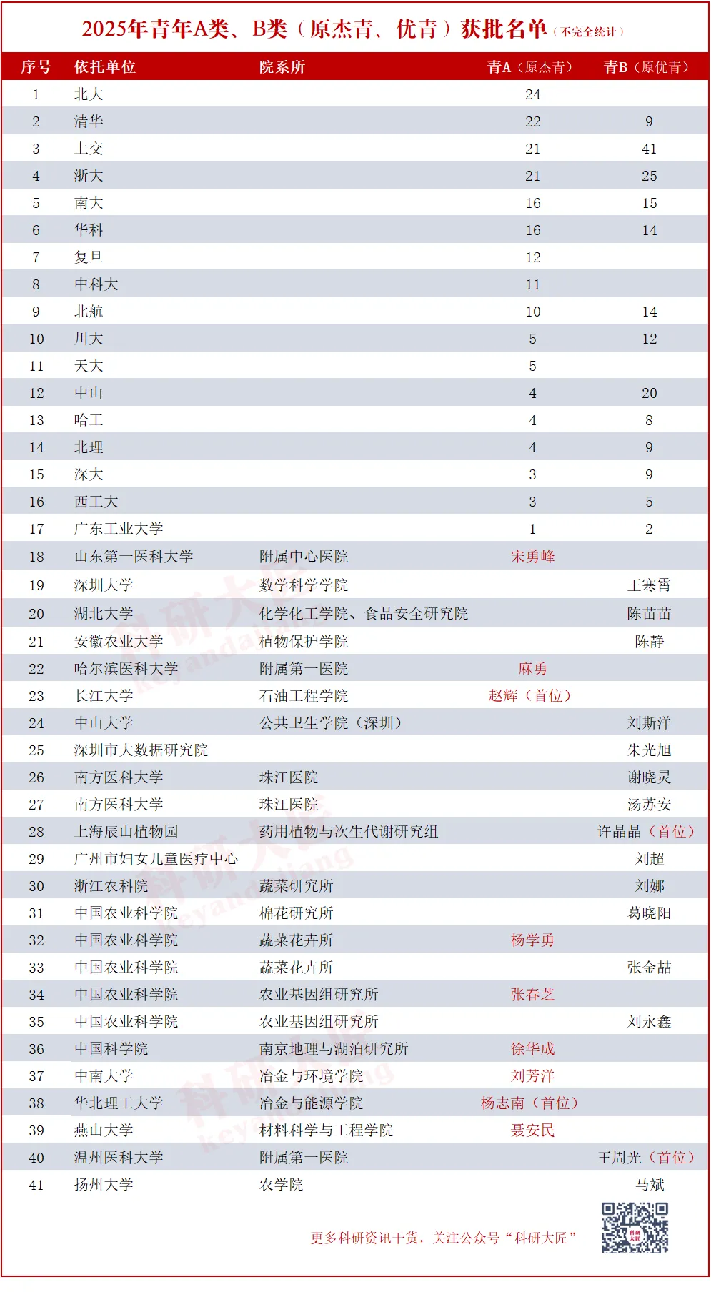 部分高校入选数:上海交通大学 41 人,浙江大学 25 人,中山大学(杰青 4 人、优青 20 人)(以上数据来源网络尚不完整,仅供参考,具体以官方公布为准)
