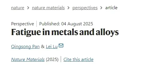 图1、疲劳强度与拉伸性能的关系© 2025 Springer Nature Limited 图2、应力应变控制下的疲劳寿命© 2025 Springer Nature Limited 图3、不同微观结构纯Cu的疲劳机制© 2025 Springer Nature Limited 图4、合金的疲劳机制© 2025 Springer Nature Limited 图1系统揭示金属疲劳强度(σ-1)与抗拉强度(σUTS)的非线性关联,指出均质材料(如超细晶铜)因塑性丧失导致低周疲劳寿命骤降,建立异质结构设计理论基础;图2对比不同材料的疲劳性能:梯度纳米晶铜(GNG-Cu)在相同应变幅下寿命较均质材料翻倍,且高取向纳米孪晶铜(nt-Cu)同时实现高疲劳强度(90MPa)与长寿命,突破传统强度-寿命矛盾;图3通过原位电镜揭示机制:梯度结构通过分层屈服抑制应变局部化;图4验证极端环境应用:梯度位错结构304不锈钢显著降低棘齿应变速率,层状金属陶瓷复合材料通过界面韧化机制阻断裂纹扩展,凸显其在多场耦合载荷下的工程价值。