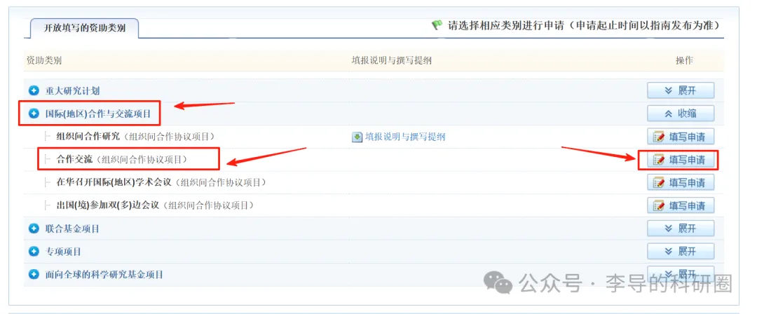 在众多项目类型中,我们选择展开国际(地区)合作与交流项目:选择第二个(合作交流),点击 “填写申请”。