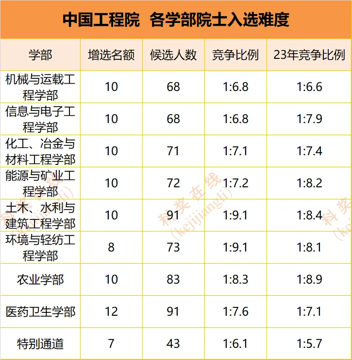 中国工程院院士增选有效候选人660人(含特别通道有效候选人43人),计划增选总名额不超过100名。中国科学院院士增选有效候选人639人(含特别推荐有效候选人50人),计划增选名额不超过100名。科奖在线统计了各学部增选名额和有效候选人的比例,基本可以反映各学部院士的竞争难度。具体统计如下: