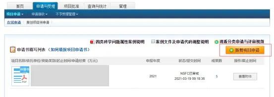 第一步:请各位申请人登录国家自然科学基金申请系统,打开“申请与受理”的页面,随后点击“新增项目申请”。