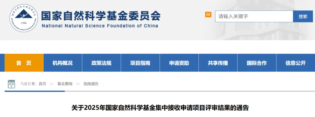 关于2025年国家自然科学基金集中接收申请项目评审结果的通告
