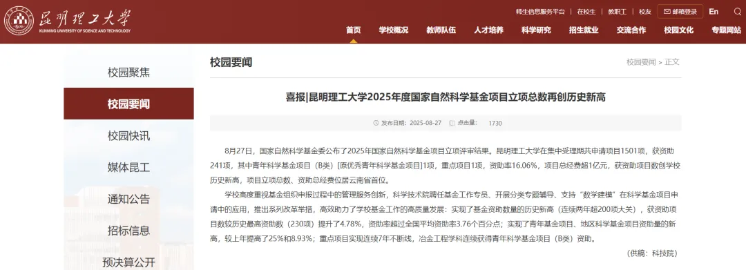 据昆明理工大学官网消息,昆明理工大学在集中受理期共申请项目1501项,获资助241项,其中青年科学基金项目(B类)1项,重点项目1项,资助率16.06%,项目总经费超1亿元,获资助项目数创学校历史新高,项目立项总数、资助总经费位居云南省首位。