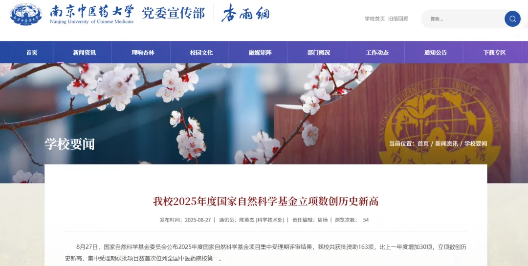 据南京中医药大学官网消息,南京中医药大学共获批资助163项,比上一年度增加30项,立项数创历史新高,集中受理期获批项目数首次位列全国中医药院校第一。