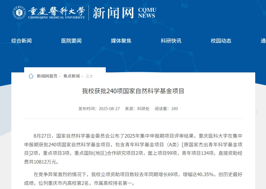 据重庆医科大学新闻网消息,重庆医科大学在集中申报期获批240项国家自然科学基金项目,包含青年科学基金项目(A类)2项,重点项目3项,重点国际(地区)合作研究项目2项,面上项目99项,青年项目134项。直接资助经费共10812万元。