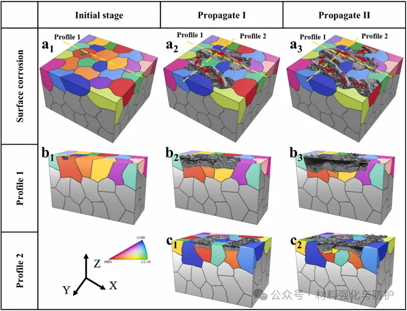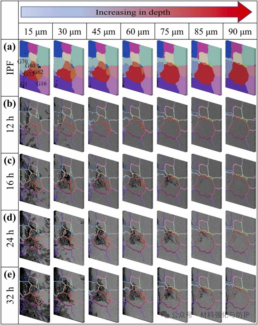 长期浸泡后基面取向晶粒的腐蚀体积分数明显更高且发生严重局部深度腐蚀的晶粒主要为该取向。当基面取向晶粒内的三维腐蚀传播路径与非基面取向晶粒的晶界相交时,腐蚀会在一定程度上延伸到非基面取向晶粒的深度方向。