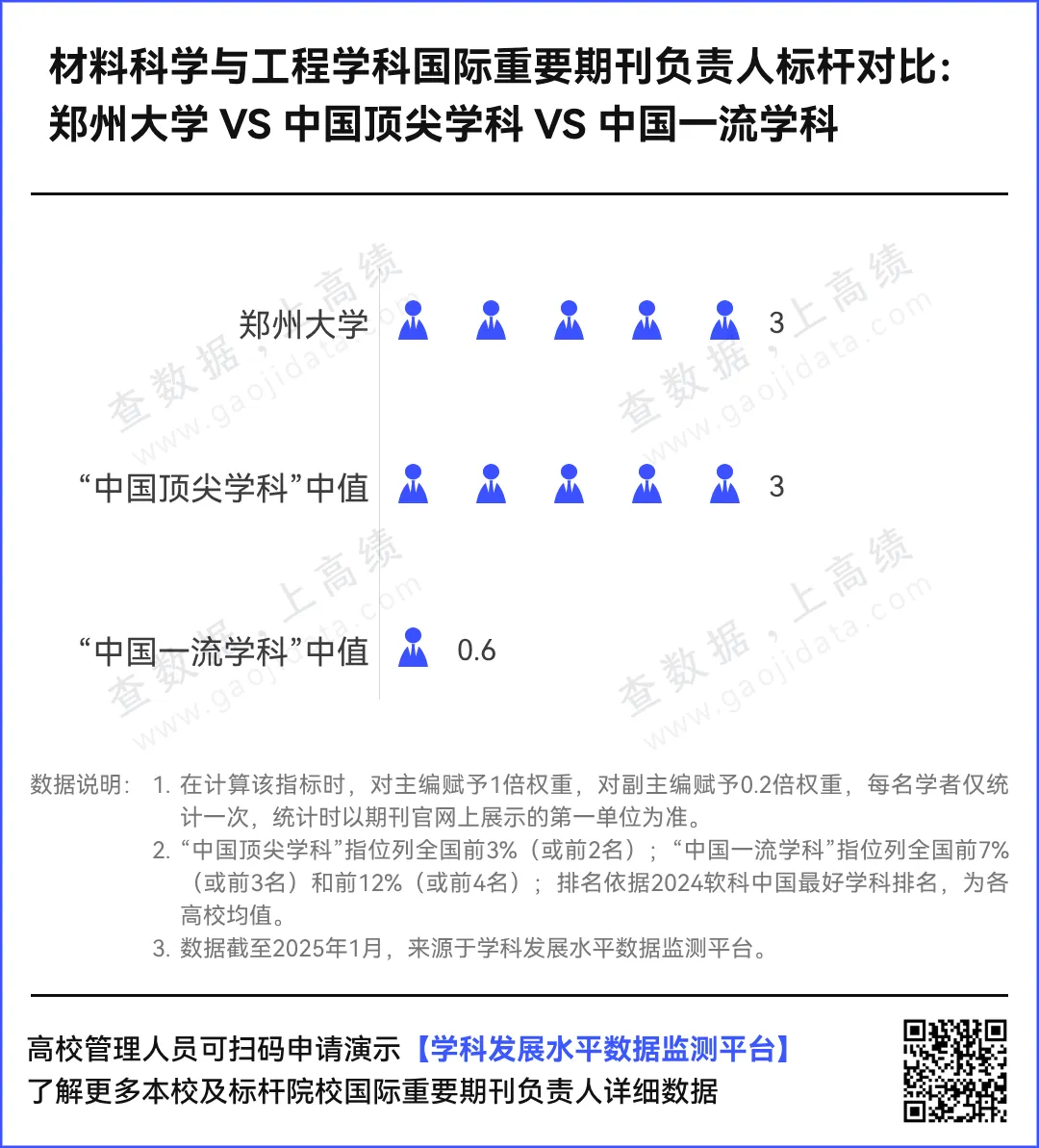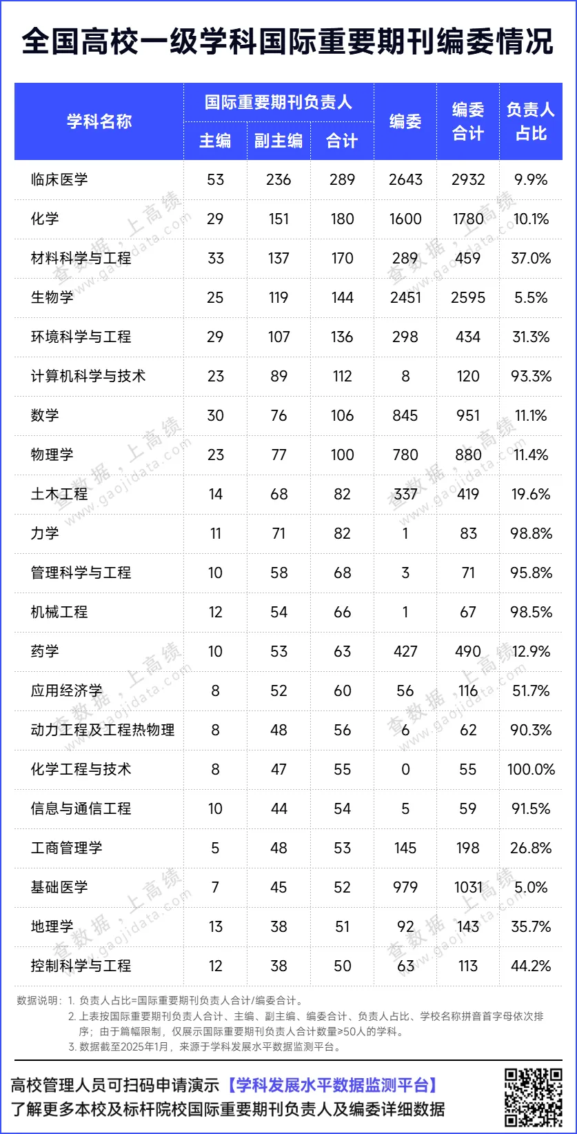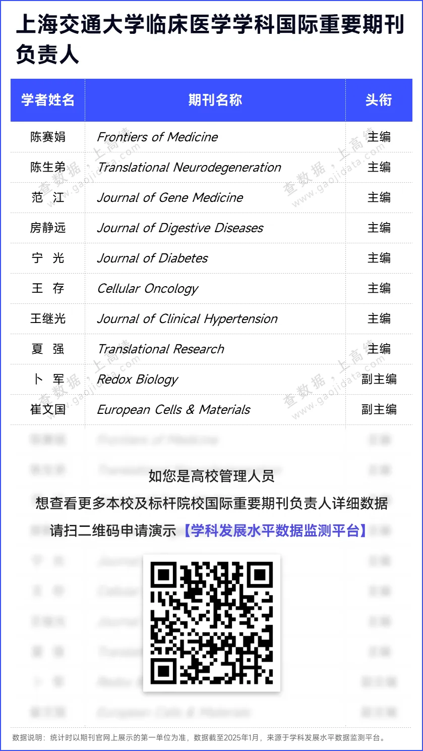 作为国际话语权的重要组成部分,国际学术话语权体现了一个国家在世界范围的学术影响力,是衡量国际影响力的重要尺度。在提升我国国际学术话语权的过程中,高校责无旁贷。国际重要期刊负责人及编委数据均来源于【学科发展水平数据监测平台】,平台实时监测350+项学科发展指标,助力学科管理人员及时掌握学科动态、客观评价学科水平、精准发现学科短板、统筹优化资源分配。授权用户可登录【学科发展水平数据监测平台】,查看本校及对标学校国际重要期刊负责人及编委详细数据。未授权用户,可以扫描下方二维码,申请演示。