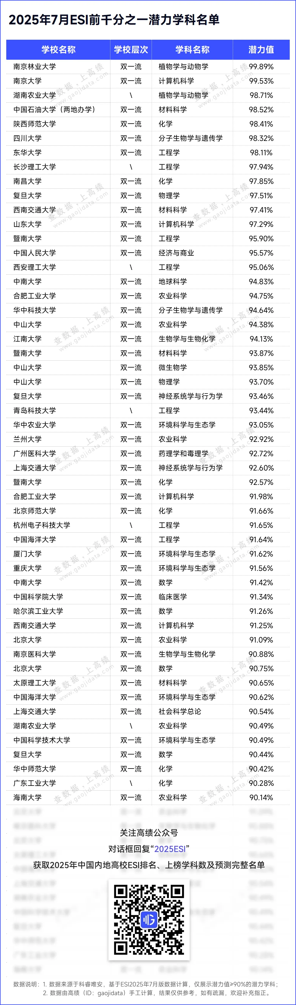 7月10日,科睿唯安(Clarivate Analytics)公布了2025年7月ESI学科排名,与5月相比,4所高校新增ESI前万分之一学科,6所高校共新增6个前1‰学科。9月ESI发布在即,哪些高校的学科有望在9月榜单中有所突破?