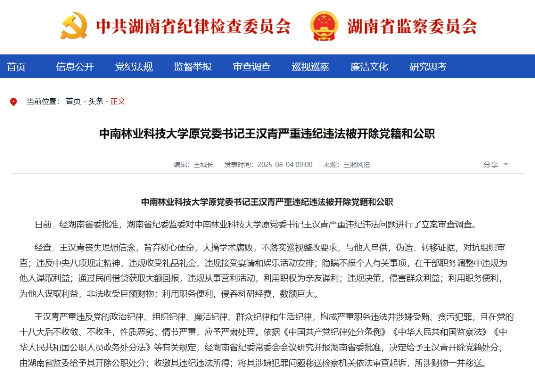 值得一提的是,王汉青被查6天前,中南林业科技大学原校长廖小平被查。