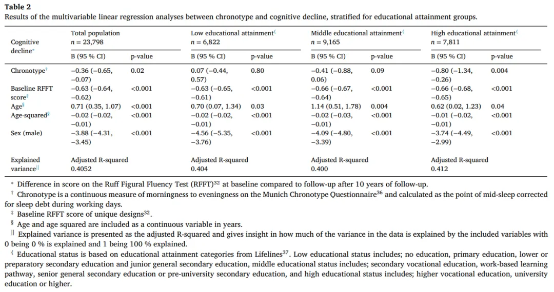 表2中显示了变量相关性。该研究证实,长期晚睡,会让认知更容易下降。