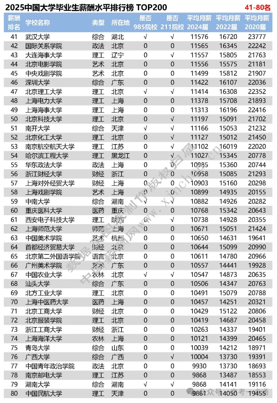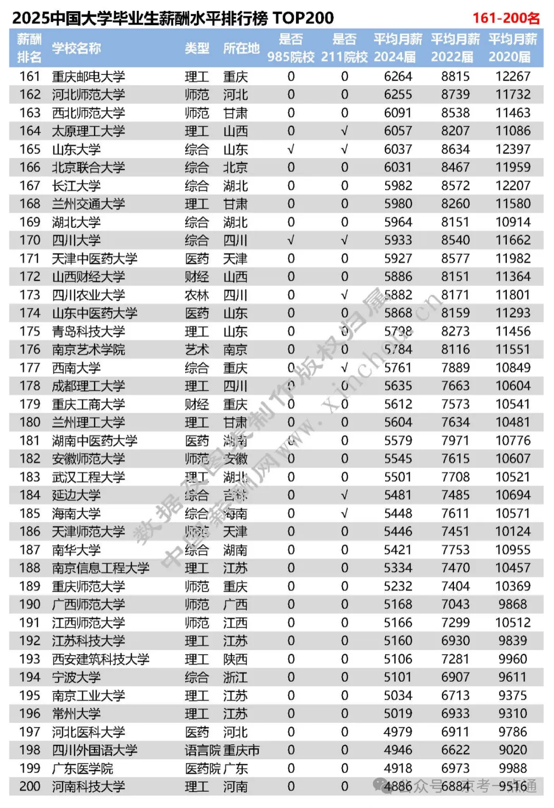 导语摘要: 高校毕业生薪酬直观反映了就业情况和历年收入变化,对毕业生就业及企业人才需求等具有重要参考意义。京考一点通(ID:bjgkzx)根据2025年全国高校毕业生薪酬排行榜TOP200,整理了最新高校毕业生薪酬情况,建议收藏本文~ 一 行业薪酬增长率排行 欢迎各位家长和同学加入【2026高考北京升学群】,群内每日分享升学动态、招录数据分析、热门试题答案等优质内容,扫码进群备考交流↓↓↓ 二 2025各高校毕业生薪酬水平 每年发布的《全国高校毕业生薪酬排行榜TOP200》采用全国各高校上年度毕业生进入用人单位满一年的薪酬数据,包括基础工资、奖金和补贴等年度总收入。 数据来源于全国各高校24届毕业生进入用人单位工作的月薪数据,包括国内300多个城市地区、400多个行业及细分领域、50多万家企业,100万多万条毕业生数据,以统计学模型计算得出。 全国高校毕业生薪酬排名既反映了各高校毕业生就业状况和历年收入变化,也反映了各高校专业学科与企业相关工作岗位的匹配程度,对客观分析高校毕业生就业趋势、企业人才需求状况,以及工作岗位发展走势具有重要参考意义。 以下为2025全国高校毕业生薪酬水平排行榜 TOP200 今年的排行榜中, 整体薪资相较于去年整体呈小幅上涨,大部分上涨幅度在100-300元左右。今年排名前200的高校,大都因专业设置符合当前经济环境和新兴行业人才需求,包括工资水平、就业率、人才成长率、薪酬增长率在内各项指标增幅均较为明显。 数据显示,985、211院校毕业生就业机会较多、就业质量较好,而且入职后薪酬水平相对较高;但是很多双非院校也表现出了它的闪光点和优势所在。