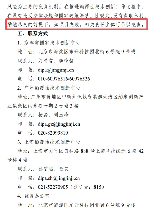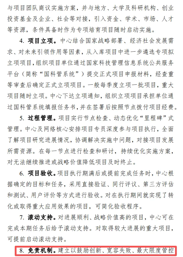 8.免责机制。建立以鼓励创新、宽容失败、最大限度管控风险为主导的免责机制。在推进颠覆性技术创新工作过程中,在没有违反法律法规和国家政策等禁止性规定、没有谋取私利、勤勉尽责的前提下,如项目失败,相关责任主体可予以免责。