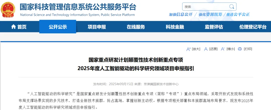 国家重点研发计划颠覆性技术创新重点专项2025年度人工智能驱动的科学研究领域项目申报指引
