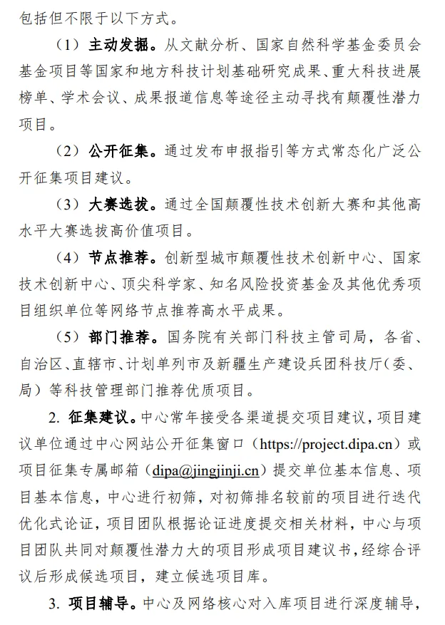 2.征集建议。中心常年接受各渠道提交项目建议,项目建议单位通过中心网站公开征集窗口(https://project.dipa.cn)或项目征集专属邮箱(dipa@jingjinji.cn)提交单位基本信息、项目基本信息,中心进行初筛,对初筛排名较前的项目进行迭代优化式论证,项目团队根据论证进度提交相关材料,中心与项目团队共同对颠覆性潜力大的项目形成项目建议书,经综合评议后形成候选项目,建立候选项目库。