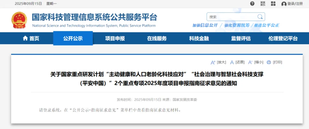 关于国家重点研发计划“主动健康和人口老龄化科技应对”“社会治理与智慧社会科技支撑(平安中国)”2个重点专项2025年度项目申报指南征求意见的通知
