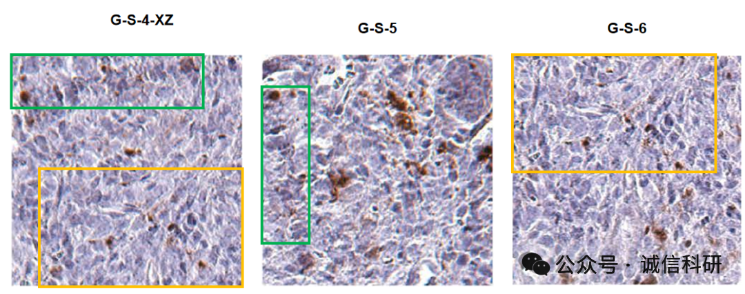 对所有图片(除蛋白印迹)进行检测,iFigures发现涉嫌5对图片重复使用:4f-1与4h-3涉嫌部分重叠;G-E9a-14(G-S-4)与G-S-5涉嫌部分重叠;G-E9a-14(G-S-4)与G-S-6涉嫌部分重叠;G-S-4与G-S-5涉嫌部分旋转重叠;G-S-4与G-S-6涉嫌部分旋转重叠。也就是说,G-E9a-14(G-S-4)、G-S-5及G-S-6来自同一张显微切片,由于G-E9a-14与G-S-4是同一张切片,诚信科研就以G-S-4叙述为主。其中G-E9a是图E9a的更正图片,G-S为POLR2Aneutral和POLR2Aloss肿瘤的casp-3染色原始图片。