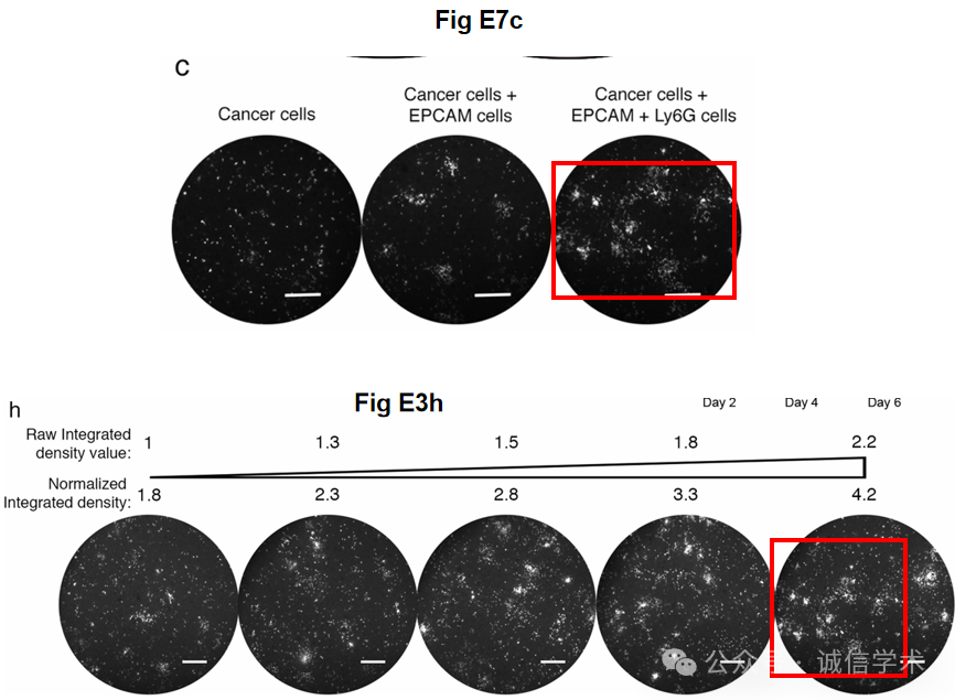 对所有图片(除蛋白印迹)进行检测,iFigures发现涉嫌2对图片重复使用:图4b-4与E9a-3涉嫌重叠,E9a-3与E9e-6涉嫌明显的重叠。