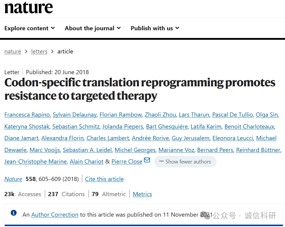 [8]诚信科研通过筛库,发现2018年6月20日,比利时列日大学Pierre Close(Pierre Close教授是表观遗传学和基因转录研究领域一颗冉冉升起的明星。他凭借在剑桥积累的深厚功底,回到列日大学后建立了世界水平的研究团队。他的工作从最基础的分子机制出发,最终目标是理解并攻克像癌症这样的复杂疾病)团队在Nature 杂志上发表题为“Codon-specific translation reprogramming promotes resistance to targeted therapy” 的研究文章(2021年11月11日对大量内容及图片进行了更正),文章内涉嫌1对图片重复使用。