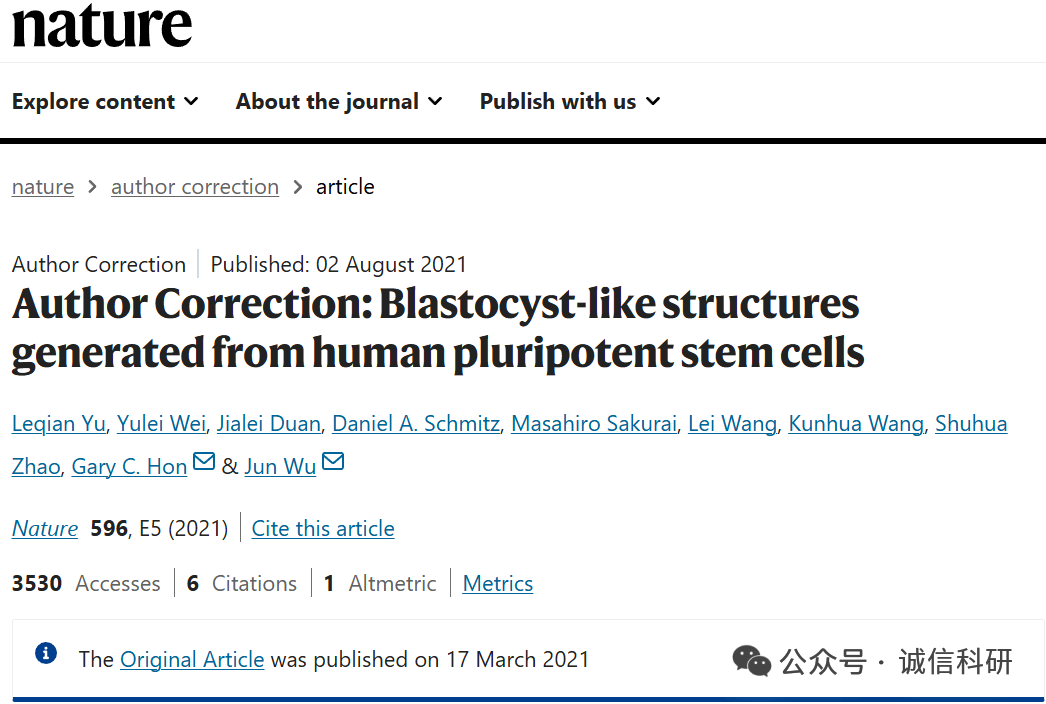 [4]诚信科研通过筛库,发现2021年3月17日,德州大学西南医学中心吴军团队在Nature 杂志上发表题为“Blastocyst-like structures generated from human pluripotent stem cells” 的研究文章(2021年8月2日更正过一次),文章内涉嫌1对图片重复使用。截至到2025年8月20日,该文章已经被引用412次。