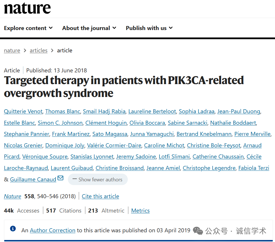 [12]诚信科研通过筛库,发现2018年6月13日,巴黎笛卡尔大学Guillaume Canaud团队在Nature 杂志上发表题为“Targeted therapy in patients with PIK3CA-related overgrowth syndrome” 的研究文章(2019年4月3日对更正过一次),文章内涉嫌1对图片重复使用。