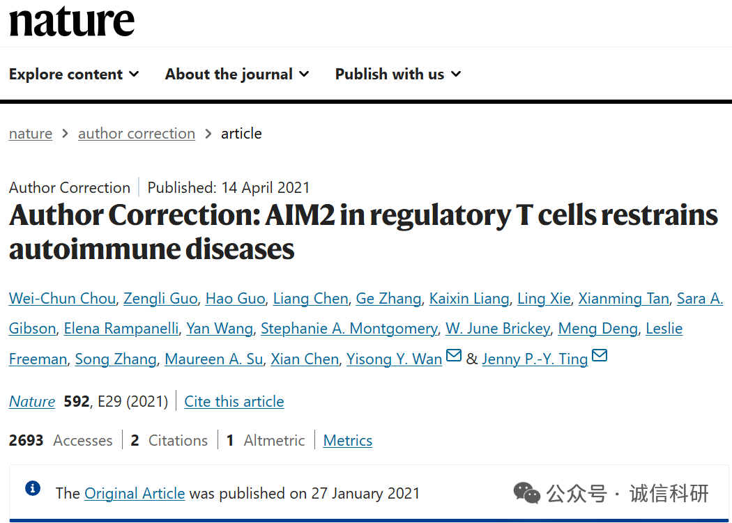 [5]诚信科研通过筛库,发现2021年3月17日,北卡罗来纳大学教堂山分校Jenny P.-Y. Ting团队(2022年当选为美国科学院院士)在Nature 杂志上发表题为“AIM2 in regulatory T cells restrains autoimmune diseases” 的研究文章(2021年4月14日更正过一次),文章内涉嫌2对图片重复使用。截至到2025年8月20日,该文章已经被引用139次。