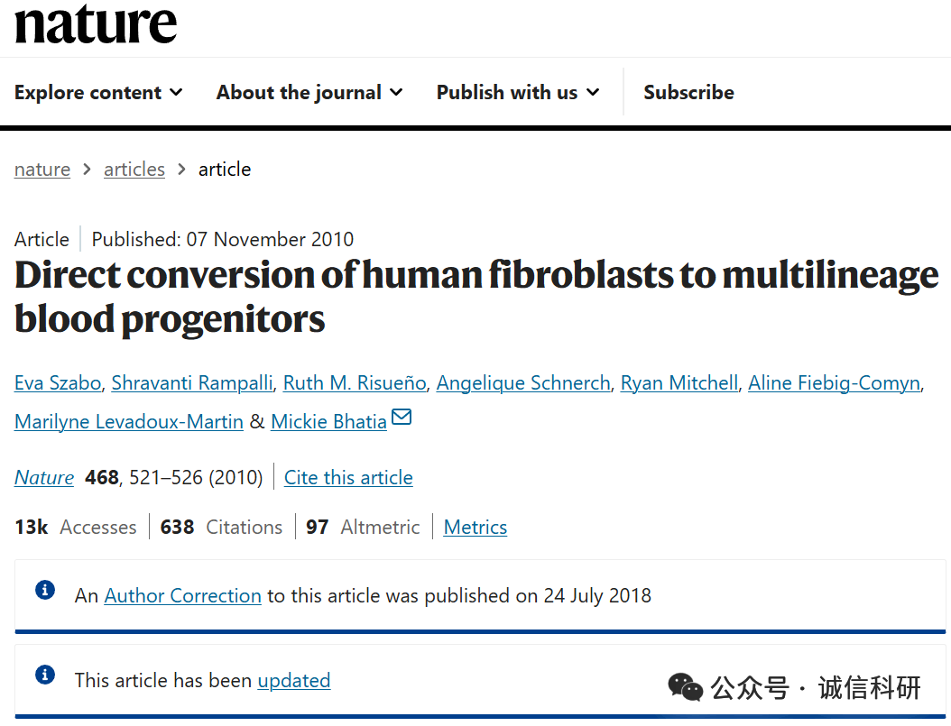 [2]诚信科研通过筛库,发现2015年4月22日,加拿大麦克马斯特大学Mickie Bhatia团队在Nature 杂志上发表题为“Direct conversion of human fibroblasts to multilineage blood progenitors” 的研究文章(2018年7月24日更正过一次),文章内涉嫌4对图片重复使用。