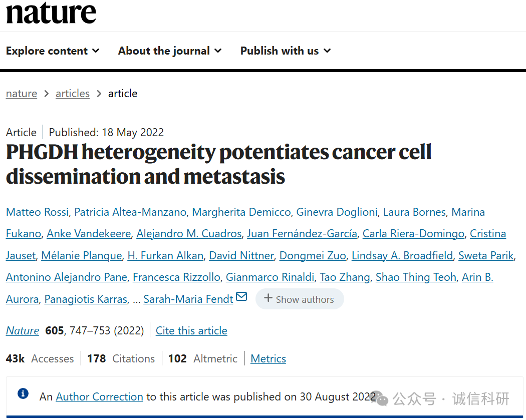 [7]诚信科研通过筛库,发现2022年5月18日,比利时鲁汶大学Sarah-Maria Fendt(Sarah-Maria Fendt 教授是当今癌症代谢研究领域,尤其是与转移相关方向的领军人物之一。她的工作深刻地改变了人们对癌细胞如何通过重编程代谢来驱动最致命阶段——转移的理解,并为开发新的治疗策略带来了希望)团队在Nature 杂志上发表题为“PHGDH heterogeneity potentiates cancer cell dissemination and metastasis” 的研究文章(2022年8月30日更正过一次),文章内涉嫌1对图片重复使用。