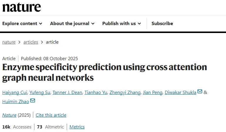 近日,Nature杂志以“Accelerated Article Preview”(加快评审文章)的形式发表了这篇论文。这项研究,打破了百年来酶功能预测依赖“试错实验”的困境。崔海洋与赵惠民团队开发的通用AI模型,首次实现“输入酶与底物信息,直接预测催化反应”。而他们构建的ESIbank数据库,更成为全球首个整合辅因子信息的酶-底物结构资源库。这些成就,为合成生物学的产业化应用按下“加速键”。