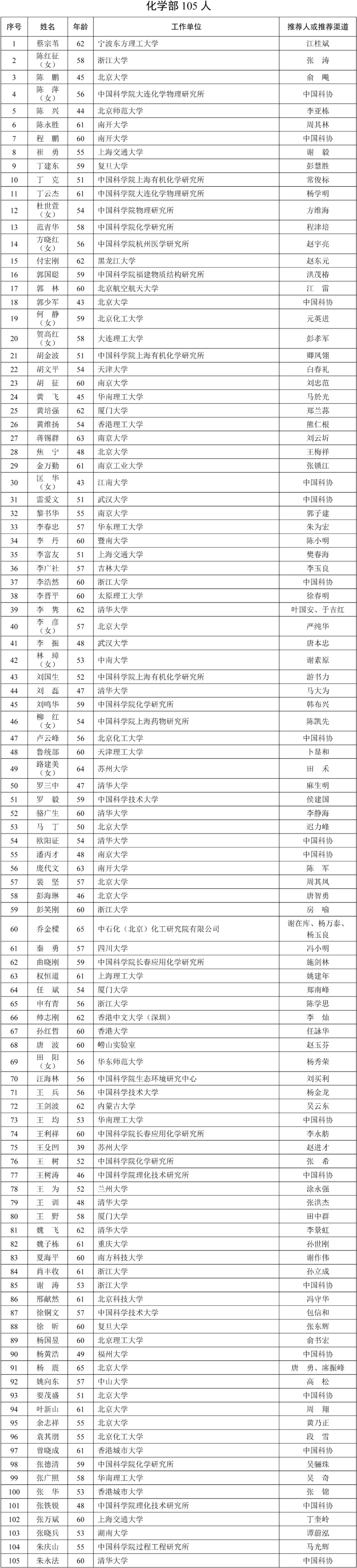 中国工程院和中国科学院公布2025年院士增选有效候选人,其中中国工程院有效候选人共660人。2025年中国科学院院士增选有效候选人639人。汇总如下: 机械与运载工程学部68人 序号 姓名 出生年月 工作单位 提名人/提名渠道 1 陈善广 1962年12月 中国载人航天工程办公室 周建平 2 陈新 1960年2月 广东工业大学 谭建荣 3 陈勇 1967年8月 中国商用飞机有限责任公司 吴光辉 4 崔平远 1961年11月 北京理工大学 中国科协 5 邓景辉 1965年7月 中国直升机设计研究所 曹喜滨 6 丁水汀 1967年11月 中国民航大学 尹泽勇 7 董瑶海 1966年3月 中国航天科技集团有限公司第八研究院 中国科协 8 冯江华 1964年11月 中车株洲电力机车研究所有限公司 丁荣军 9 冯军 1966年10月 中航工业第一飞机设计研究院 唐长红 10 高峰 1956年12月 上海交通大学 陈学东(中国机械工业集团有限公司)、邓宗全 11 高凤林 1962年3月 首都航天机械有限公司 中国科协 12 高仕斌 1964年11月 西南交通大学 邱志明 13 何国强 1962年10月 西北工业大学 王振国 14 黄海军 1964年6月 北京航空航天大学 中国科协 15 黄维娜(女) 1968年10月 中国航发贵阳发动机设计研究所 刘永泉 16 姜春兰(女) 1962年3月 北京理工大学 杨树兴 17 金会庆 1956年11月 安徽三联学院 赫晓东、杨善林 18 柯映林 1963年2月 浙江大学 杨华勇 19 匡光力 1961年9月 中国科学院合肥物质科学研究院 中国科协 20 雷丙旺 1966年6月 内蒙古北方重工业集团有限公司 蒋庄德 21 李概奇 1966年11月 中国航发湖南动力机械研究所 中国科协 22 李高鹏 1976年8月 宇通客车股份有限公司 中国科协 23 李建斌 1962年10月 中国中铁股份有限公司 中国科协 24 励行根 1962年12月 宁波天生密封件有限公司 中国科协 25 廉玉波 1964年4月 比亚迪股份有限公司 李骏 26 梁纪秋 1974年12月 航天科工火箭技术有限公司 中国科协 27 廖志忠 1962年10月 中国空空导弹研究院 樊会涛 28 凌文辉 1968年8月 中国航天科工集团三十一研究所 朱坤 29 刘春跃 1962年3月 中国船舶集团有限公司七五〇试验场 马玉山 30 龙伟民 1966年9月 中国机械总院集团郑州机械研究所有限公司 中国科协 31 路新春 1966年5月 清华大学 李克强 32 罗志军 1968年11月 中国航天科技集团有限公司第八研究院 中国科协 33 梅雪松 1963年4月 西安交通大学 王华明 34 孟光 1961年1月 上海交通大学 中国科协 35 齐乃明 1962年3月 哈尔滨工业大学 中国科协 36 屈也频 1962年10月 中国人民解放军海军研究院 宋保维 37 唐涛 1963年2月 北京交通大学 中国科协 38 陶飞 1981年2月 北京航空航天大学 王国庆 39 童水光 1960年9月 浙江大学 中国科协 40 王彬文 1974年10月 中国飞机强度研究所 王向明 41 王成勇 1964年12月 广东工业大学 中国科协 42 王德平 1968年10月 中国第一汽车股份有限公司 中国科协 43 王克鸿 1963年2月 南京理工大学 付梦印 44 王黎钦 1964年9月 哈尔滨工业大学 中国科协 45 王时龙 1966年8月 重庆大学 黄庆学 46 王永庆 1965年2月 中国航空工业集团公司沈阳飞机设计研究所 孙聪 47 吴希明 1964年9月 中国航空研究院 中国科协 48 吴晓光 1960年7月 中国船舶集团有限公司 李春明 49 吴玉厚 1955年7月 沈阳建筑大学 李培根、王海福 50 夏桂华 1962年4月 哈尔滨工程大学 杨德森 51 徐西鹏 1965年6月 华侨大学 王树新 52 徐向阳 1965年5月 北京航空航天大学 焦宗夏 53 杨世春 1974年3月 北京航空航天大学 王云鹏 54 杨卫民 1965年11月 北京化工大学 中国科协 55 叶聪 1979年11月 中国船舶科学研究中心 徐青 56 苑世剑 1963年1月 哈尔滨工业大学 郭东明 57 苑伟政 1961年2月 西北工业大学 项昌乐 58 张兵 1966年4月 中国船舶集团有限公司系统工程研究院 中国科协 59 张崇峰 1968年11月 上海航天技术研究院 中国科协 60 张弘 1962年9月 江西洪都航空工业集团有限责任公司 甘晓华 61 赵红卫(女) 1969年11月 中国铁道科学研究院集团有限公司 田红旗 62 赵维谦 1966年9月 北京理工大学 孙逢春 63 赵祥模 1966年8月 西安建筑科技大学 严新平 64 赵玉龙 1968年3月 西安交通大学 邹汝平 65 周华民 1974年7月 华中科技大学 尤政 66 朱衍波 1970年12月 民航数据通信有限责任公司 向锦武 67 朱祖超 1966年3月 浙江理工大学 中国科协 68 祝小平 1963年9月 西北工业大学 中国科协 信息与电子工程学部68人 序号 姓名 出生年月 工作单位 提名人/提名渠道 1 安建平 1965年5月 北京理工大学 黄殿中 2 曹先彬 1969年1月 北京航空航天大学 陈志杰 3 陈虹(女) 1963年12月 同济大学 童小华 4 程承旗 1961年3月 北京大学 中国科协 5 程学旗 1971年2月 中国科学院计算技术研究所 孙凝晖 6 邓中亮 1965年9月 北京邮电大学 孔志印 7 董胜波 1960年11月 中国航天科工集团第二研究院二十五所 中国科协 8 窦强 1973年5月 飞腾信息技术有限公司 王沙飞 9 樊仲维 1965年7月 中国科学院大学 姜会林 10 冯丹(女) 1970年5月 华中科技大学 陈左宁 11 付琨 1974年6月 中国科学院空天信息创新研究院 吴伟仁 12 高西奇 1967年3月 东南大学 中国科协 13 管海兵 1971年5月 上海交通大学 蒋昌俊 14 韩正甫 1962年7月 中国科学技术大学 中国科协 15 胡国平 1977年11月 科大讯飞股份有限公司 中国科协 16 华更新 1965年7月 中国航天科技集团有限公司第五研究院第五〇二研究所 中国科协 17 黄铁军 1970年11月 北京大学 丁文华 18 霍宗亮 1975年10月 长江存储科技控股有限责任