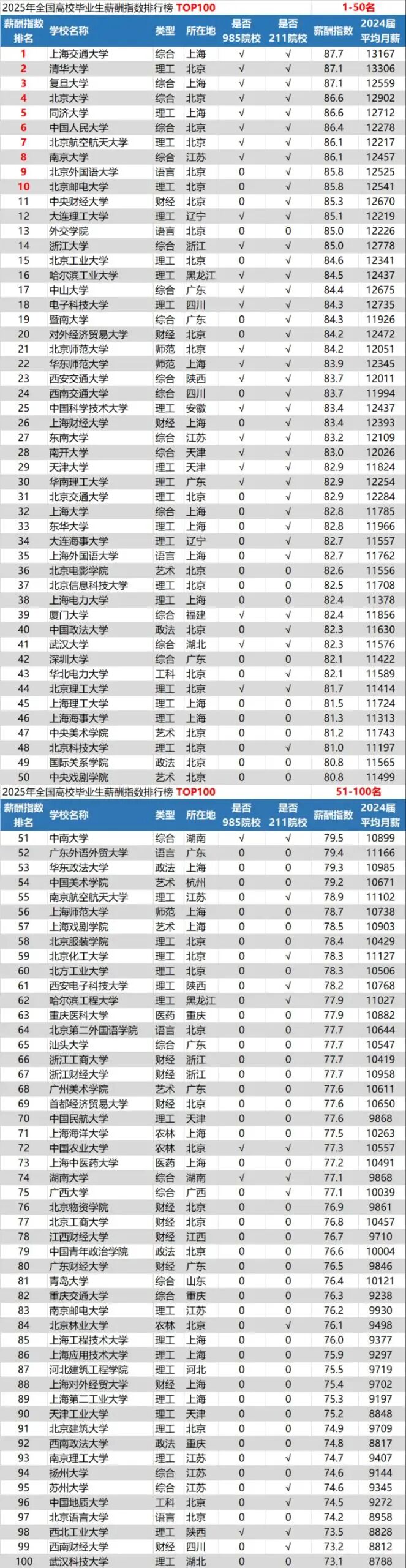 此前,中国薪酬指数研究机构发布《2025年全国高校毕业生薪酬指数排行榜TOP100》!