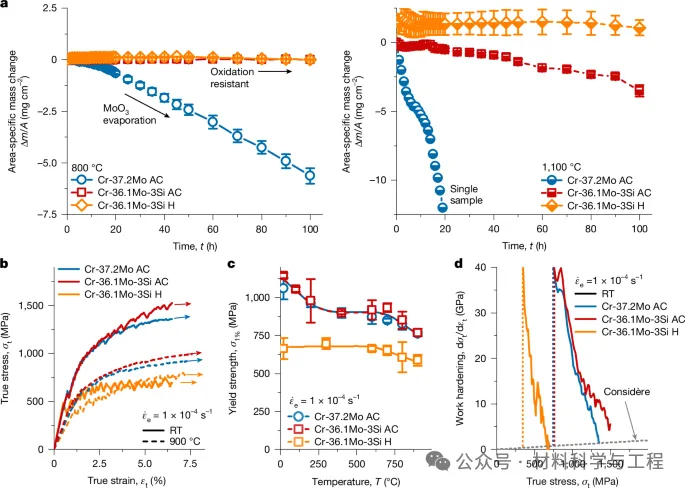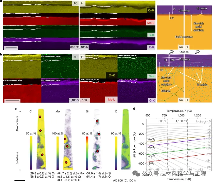 针对这一挑战,来自德国波鸿鲁尔大学等单位的研究人员在《Nature》发表了题为“A ductile chromium–molybdenum alloy resistant to high-temperature oxidation”的最新成果,显著提高了材料在高达1,100°C的高温下对灾难性氧化、氮化及氧化层剥落的抵抗能力。