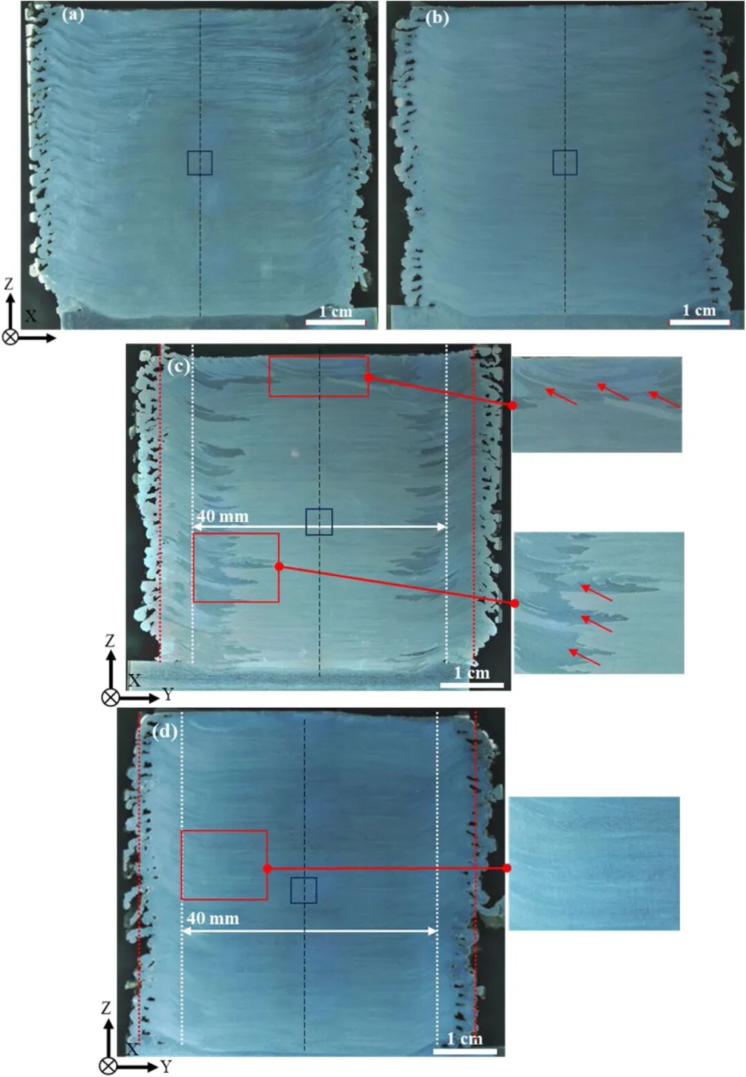 图4:(a)AFSD、(b)HHSAM、(c)AFSD-HT和(d)HHSAM-HT横截面的金相照片。