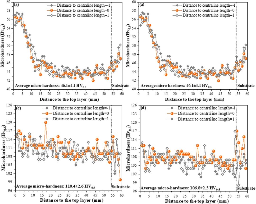 图8:(a)AFSD、(b)HHSAM、(c)AFSD-HT和(d)HHSAM-HT沿Z方向的显微硬度分布。