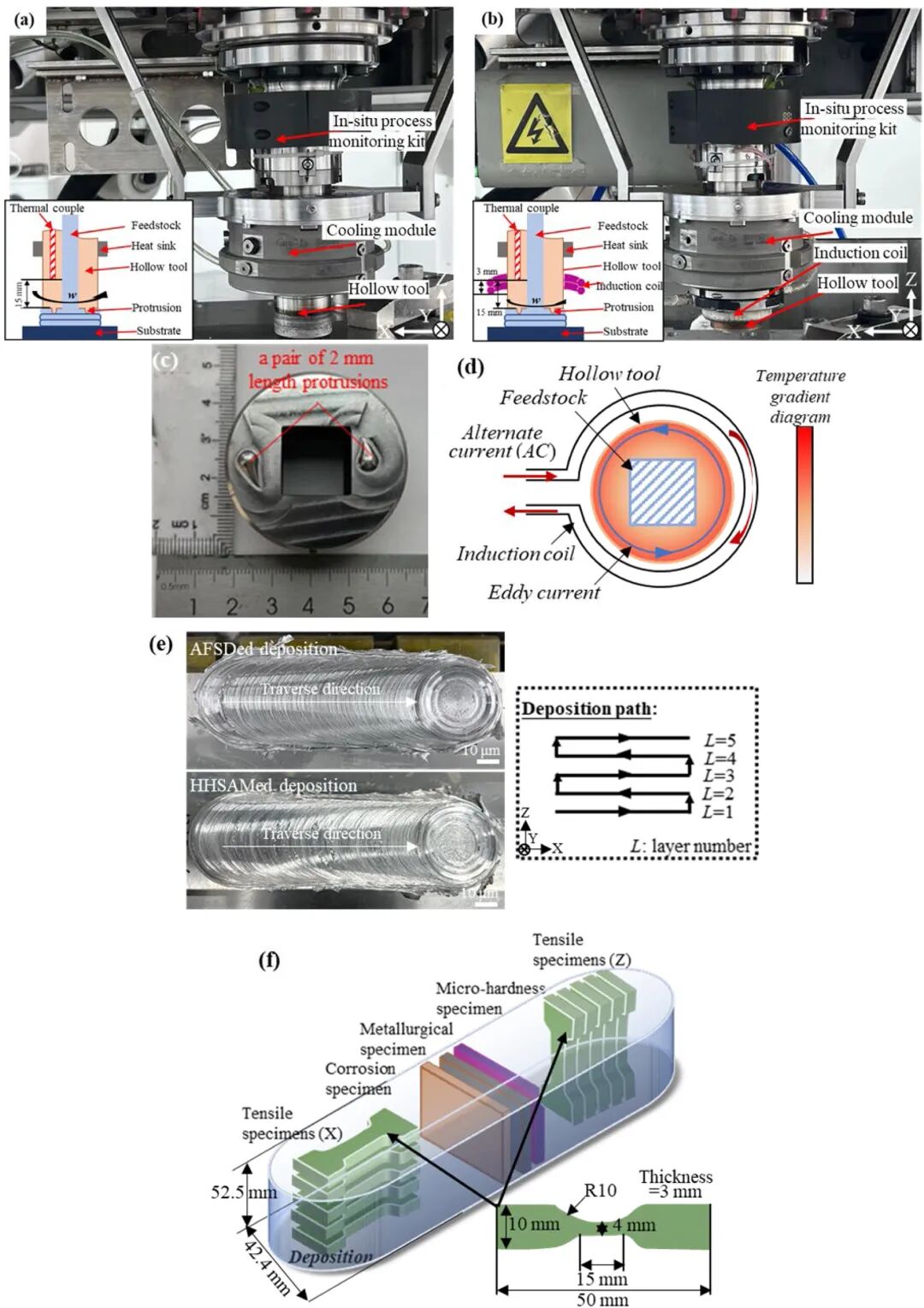 图2:(a)AFSD、(b)HHSAM工艺的照片和示意图及(c)所应用的中空工具。(d)感应加热示意图。(e)基于标记的沉积路径在沉积过程中的AFSDed和HHSAMed沉积的照片,以及(f)性能分析的取样图。
