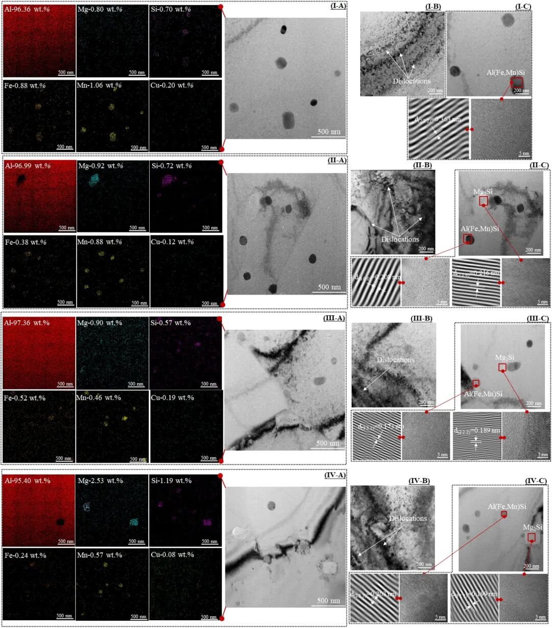 图7:(A)TEM图像和相应的EDS面扫图。(B)聚焦于位错的高倍HRTEM图像。(C)聚焦于析出相的高倍HRTEM图像和IFFT图。其中,(I)、(II)、(III)和(IV)分别代表AFSD、HHSAM、AFSD-HT和HHSAM-HT。