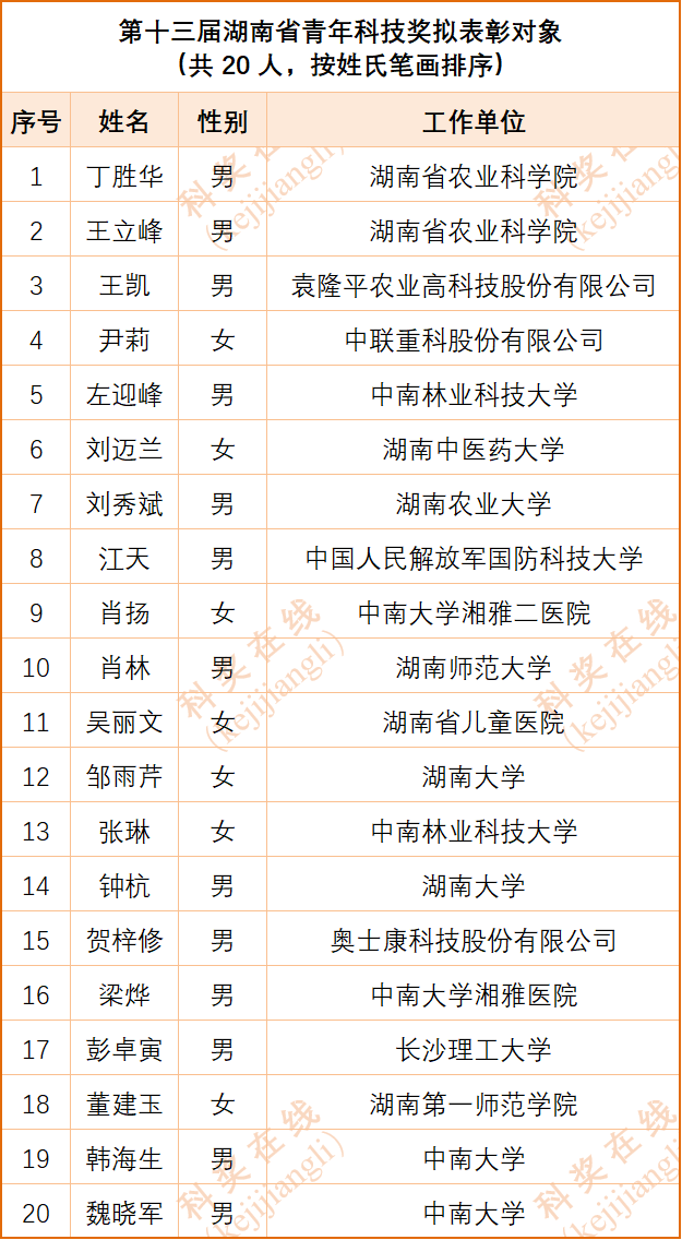 经第十三届湖南省青年科技奖评选表彰工作领导小组办公室组织专家评审,各推荐单位考察、公示,省评选表彰工作领导小组审议,产生20名第十三届湖南省青年科技奖拟表彰对象。为充分发扬民主、广泛听取意见、接受社会监督,现将第十三届湖南省青年科技奖拟表彰对象予以公示。
