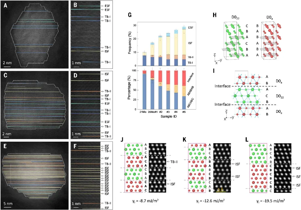 他,16岁上大学,30岁成为博士生导师,32岁任国家重点实验室主任,36岁出任中科院金属所所长;38岁当选中国科学院院士,40岁当选德国科学院院士,41岁成为《Science》首位中国评审编辑;,53岁当选美国科学院外籍院士。从本科到博士,他一直在国内接受教育,是地地道道的“中国制造”科学家。2020年,他因在纳米金属强化领域的开创性贡献荣获“未来科学大奖·物质科学奖”。他就是中国科学院院士、原辽宁省副省长、沈阳材料科学国家研究中心主任卢柯。卢柯院士长期深耕金属材料科学,率先揭示了纳米金属的变形与稳定性机制:2000年,他发现纳米铜在室温下具超塑延展性,登上《Science》;2003–2004年,再次在《Science》报道铁表面纳米化与“纳米孪晶”发现;2011年提出“梯度纳米结构”概念,实现强度与塑性的兼得;2017–2020年连续揭示纳米晶强化、热稳定性及界面结构新机制;迄今为止,他已发表14篇《Science》、1篇《Nature》,是全球金属材料领域当之无愧的领军人物。打破金属强化极限!发现“负能界面”让镍合金强度逼近理论极限!在金属材料领域,一个长期存在的难题是当晶粒细化到极限时,材料会“反而变软”。这是因为在纳米尺度下,晶界或孪晶界变得极不稳定,会滑动、旋转甚至消失,使金属失去应有的强化效果。如何在极端尺寸下仍保持结构稳定,从而进一步突破强度上限?这是材料科学家几十年来梦寐以求的目标。在此中国科学院金属研究所卢柯院士、李秀艳研究员合作在镍-钼合金中发现并构建了一类“负多余能界面”(negative excess-energy interface, NEI)。这些界面不仅不会削弱材料,反而能让晶格更稳、更强,其密度可高达每纳米一个,让金属强度逼近理论值,弹性模量达到254.5 GPa,远超所有已知镍基合金和金属玻璃。这一发现刷新了人们对金属界面能量和稳定性的传统认知,为设计超高强度金属开辟了全新方向。相关成果以“Strengthening Ni alloys with nanoscale interfaces of negative excess energy”为题发表在《Science》上,Jiongxian Li为第一作者。过去的强化手段主要依赖“细化晶粒”——晶界越多,滑移受阻越强,强度越高。但当晶粒小于约10 nm时,情况急转直下:晶界活动(迁移、旋转)主导塑性变形,导致“反Hall–Petch效应”,金属开始变软。后来人们引入低能孪晶界(TB)来延缓滑移,虽然能提高强度,但在高密度下孪晶同样会因位错作用而失稳。那么,是否存在比孪晶更稳定的界面?研究团队从理论和实验双向出发,提出一个全新概念:在特定合金体系中,若界面的形成能为负值(即“负多余能”),则这种界面将自发稳定存在,并成为天然的强化源。他们选择了钼含量高达26 at%的Ni(Mo)过饱和固溶体——钼能显著降低镍的层错能(从230 mJ/m²降至约16 mJ/m²),使得材料更容易形成致密的层错与孪晶层(图1a)。通过脉冲电沉积法制备的镍-钼合金薄片在热处理后形成了由纳米晶与层错交织构成的“密排结构迷宫”(图1b)。在透射电镜下,可以看到晶粒内部遍布高密度的层错(SF)和双晶界(TB),它们以仅0.7 nm的间距交替排列(图1c、1e),构成极为独特的纳米层状界面体系。原子级界面新相:稳定的“ABC–ABAB”混排结构常规面心立方(FCC)金属的原子层遵循ABCABC堆垛,而在镍-钼合金中,研究者发现出现了大量混合了ABAB堆垛的六方密排(HCP)层,形成了局部“FCC–HCP”共存结构(图2b)。这种结构本应不稳定,但在实验中却极为持久。统计表明,随着退火温度升高,ABAB层比例从4%增至27%,其界面占比高达39%,几乎每10个原子层就有4个是界面层(图2g)。为何这些界面如此稳定?团队利用第一性原理密度泛函理论(DFT)计算揭示了答案(图2h–l):当FCC相(D022结构)与HCP相(D0a结构)以特定取向(Shoji–Nishiyama关系)共存时,两者之间的界面能竟然为负值(–8.7至–19.5 mJ/m²)。换言之,界面的存在反而降低了体系总能量!这意味着这种“负能界面”不再是缺陷,而是促进晶体稳定的“有益结合面”。因此,在镍-钼体系中,界面越多,材料越稳、越强,这与传统金属观念完全相反。这些超高密度负能界面对材料力学性能的影响是惊人的。团队通过显微柱压缩实验发现,样品在弹性阶段应力随应变线性上升,直到约2%应变处骤然断裂,峰值应力高达5.08 GPa(图3a)。这一数值几乎接近镍的理论强度极限。更令人瞩目的是,在多次加载-卸载循环中,应力–应变曲线几乎完全重合(图3b),说明整个变形过程是可逆且无塑性流动的——材料像弹簧一样可反复承受巨大应力而不永久变形。扫描电镜显示断裂表面呈现40°倾角剪切面,典型的脆性断裂特征(图3c)。硬度测试进一步证实其强化趋势:随着界面密度增大,硬度从12.2 GPa升至13.5 GPa,远超Ni₃Mo化合物(8.4 GPa)和玻璃态样品(7.0 GPa)。绘制强度与界面间距的关系图后可见,该Ni(Mo)合金的数据点完全跳出了传统纳米晶与纳米孪晶镍的性能上限区域(图3d),形成一个全新的强化“分支”。在纳米压痕测试中,纯镍的杨氏模量约为190 GPa,而Ni(Mo)玻璃为122 GPa。随着负能界面密度增加,Ni(Mo)固溶体的模量线性提升:从207.8 GPa一路上升至254.5 GPa(图4b),不仅高于所有镍基化合物,也超过部分陶瓷和氧化物材料。值得注意的是,这种模量增强与Mo含量和制备方式无关,说明“NEI效应”是普适的物理机制。理论分析表明,层错和界面附近的原子会因非对称力场发生微畸变(约2%),并在电子结构上形成高密度局域态,显著增强键合刚度。这