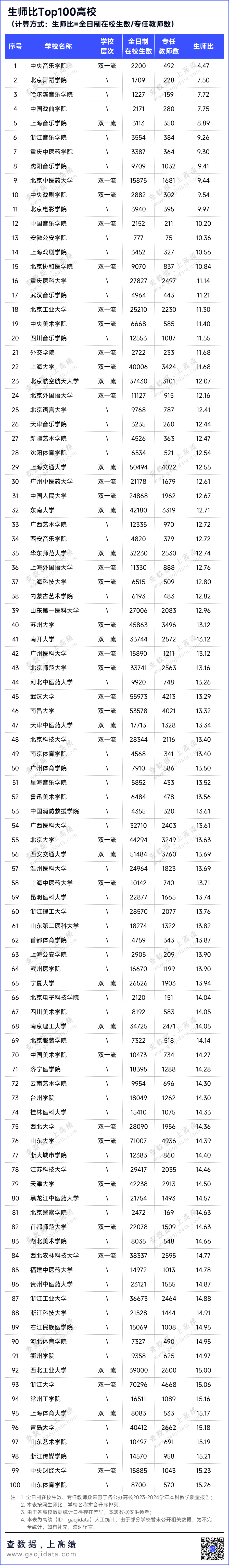 教师队伍建设水平Top100高校